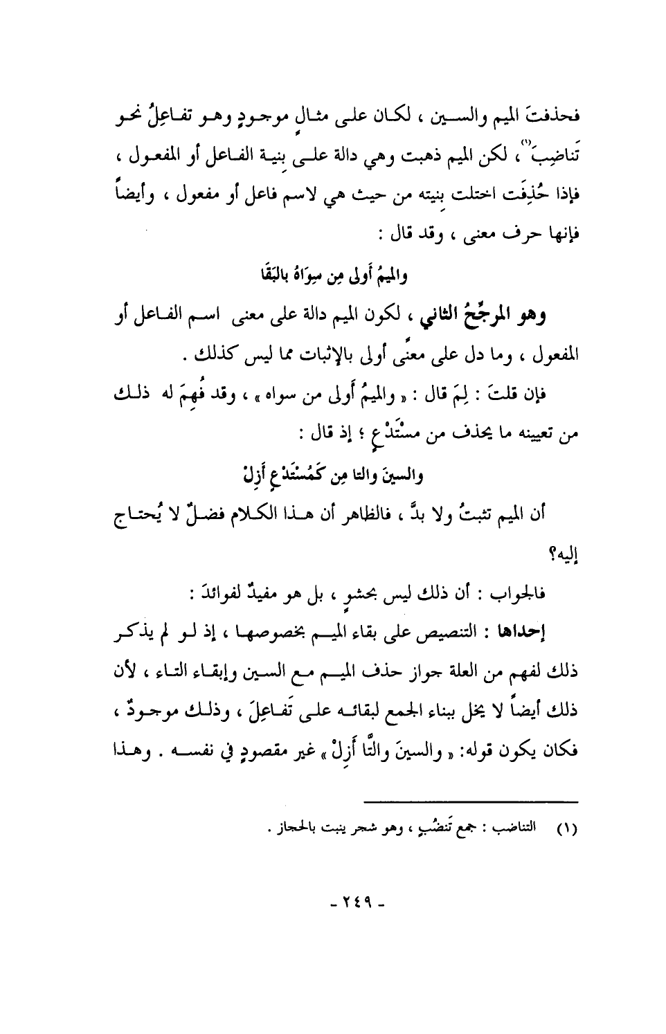 فحذفتَ الميم والسين، لكان على مثالٍ موجودٍ وهو تفاعِلُ نحو تناضِبَ، لكن الميم ذهبت وهي دالة على بنية الفاعل أو المفعول، فإذا حُذفت اختلت بنيته من حيث هي لاسم فاعل أو مفعول، وأيضاً فإنها حرف معنى، وقد قال: