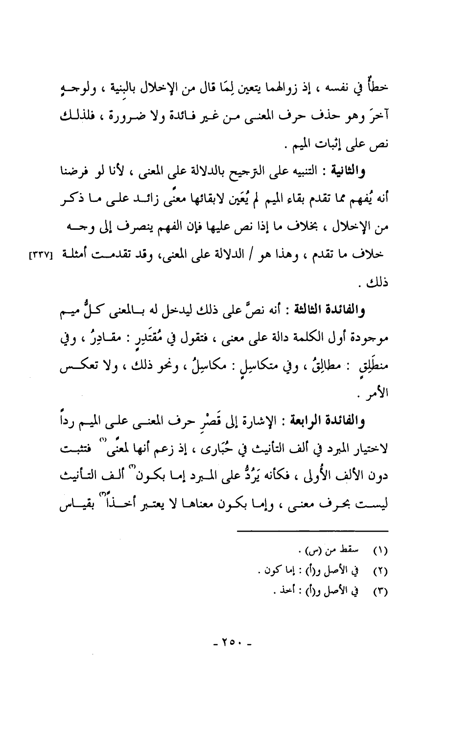 والفائدة الرابعة: الإشارة إلى قَصْرِ حرف المعنى على الميم رداً لاختيار المبرد في ألف التأنيث في حُبَارى، إذ زعم أنها لمعنًى فتثبت دون الألف الأولى، فكأنه يَرُدُّ على المبرد إما بكون ألف التأنيث ليست بحرف معنى، وإما بكون معناها لا يعتبر أخذاً بقياس