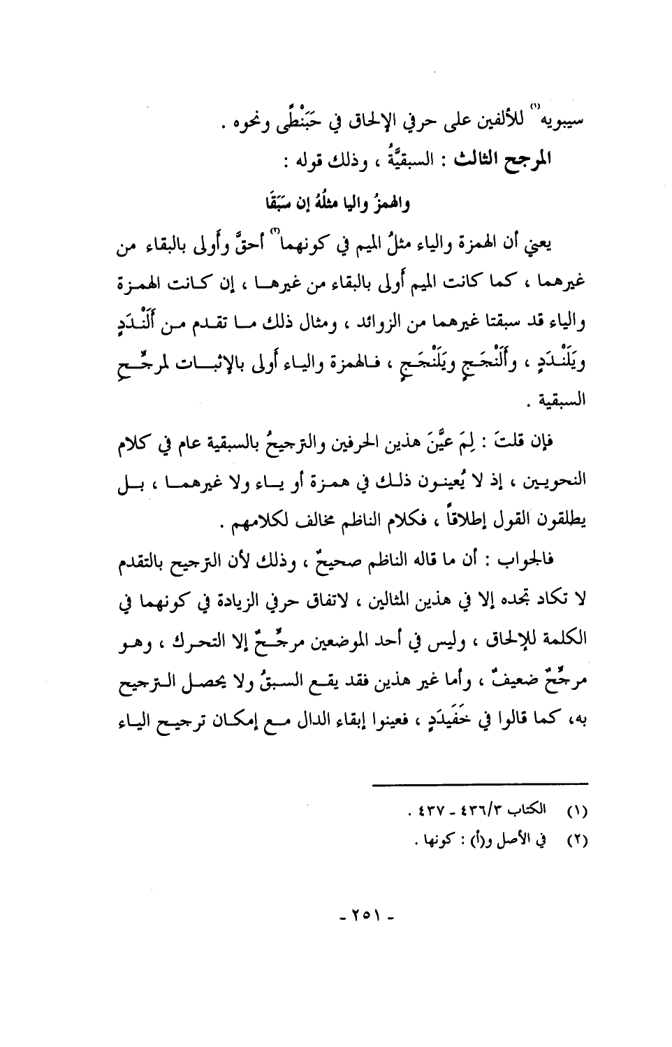 فإن قلتَ: لِمَ عيَّنَ هذين الحرفين والترجيحُ بالسبقية عام في كلام النحويين، إذ لا يُعينون ذلك في همزة أو ياء ولا غيرهما، بل يطلقون القول إطلاقاً، فكلام الناظم مخالف لكلامهم.
