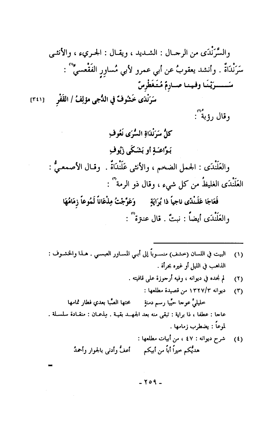 والسَّرندى من الرجال: الشديد، ويقال: الجريء، والأنثى سَرَنْداةٌ. وأنشد يعقوب عن أبي عمرو لأبي مساوِرٍ الفَقْعسي: