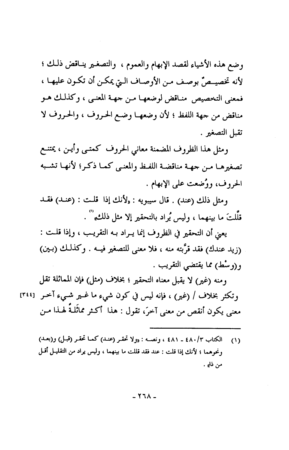 ومثل ذلك (عند). قال سيبويه: "لأنك إذا قلت: (عند) فقد قلَّلتَ ما بينهما، وليس يراد بالتحقير إلا مثل ذلك".