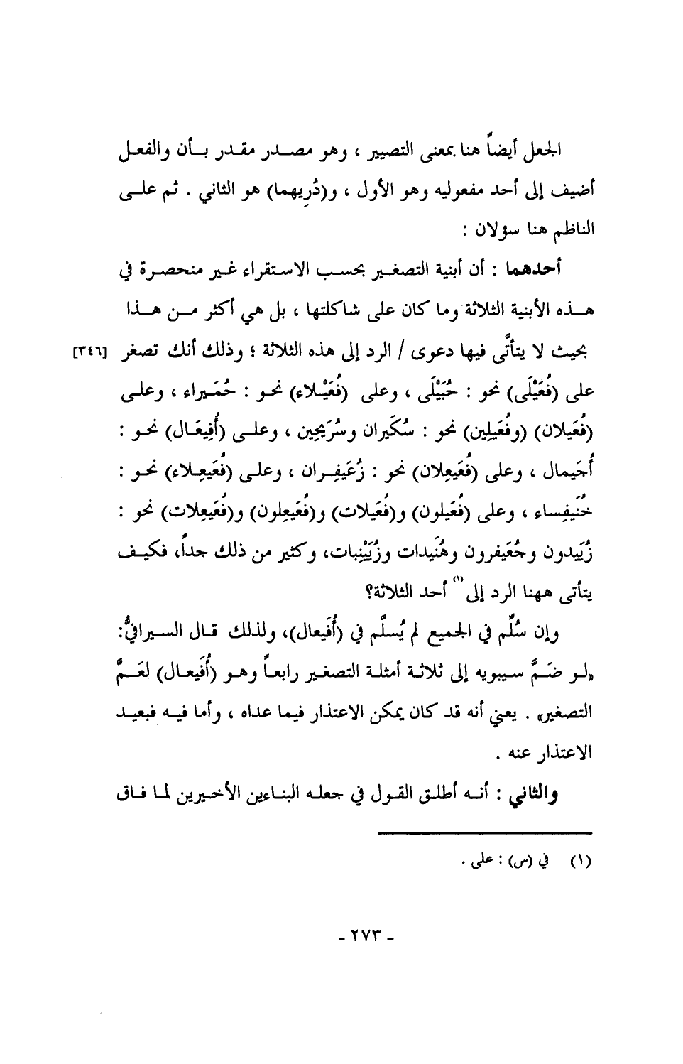 أحدهما: أن أبنية التصغير بحسب الاستقراء غير منحصرة في هذه الأبنية الثلاثة وما كان على شاكلتها، بل هي أكثر من هذا بحيث لا يتأتَّى فيها دعوى / الرد إلى هذه الثلاثة؛ وذلك أنك تصغر على (فُعَيْلَى) نحو: حُبَيْلَى، وعلى (فُعيلاء) نحو: حميراء، وعلى (فُعيلان) (وفُعَيلين) نحو: سكيران وسُريحين، وعلى (أُفيعال) نحو: أُجَيمال، وعلى (فُعَيعِلان) نحو: زعيفران، وعلى (فُعَيعِلاء) نحو: خُنَيفساء، وعلى (فُعَيلون) و (فُعيلان) و (فُعيعلات) نحو: زُيَيدون وجُعَيفرون وهنيدات وزُيَيْنِبات، وكثير من ذلك جداً، فكيف يتأتى ههنا الرد إلى أحد الثلاثة؟