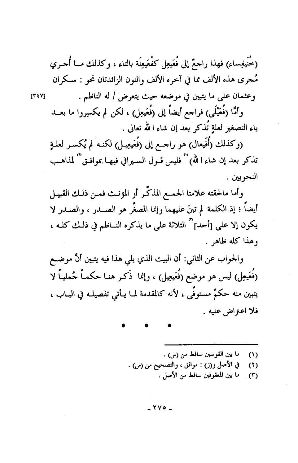 (وكذلك (أُفَيعال) هو راجع إلى (فُعَيعِيل) لكنه لم يُكسر لعلةٍ تذكر بعد إن شاء الله) فليس قول السيرافي فيها بموافق لمذاهب النحويين.