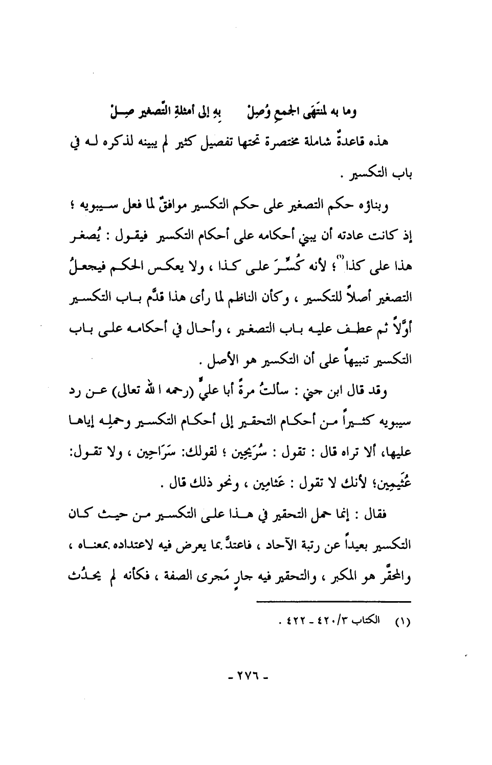 وقد قال ابن جني: سألتُ مرةً أبا عليٍّ (رحمه الله تعالى) عن رد سيبويه كثيراً من أحكام التحقير إلى أحكام التكسير وحملِه إياها عليها، ألا تراه قال: تقول: سُرَيحي؛ لقولك: سراحين، ولا تقول: عُثَيمين؛ لأنك لا تقول: عَثامين، ونحو ذلك قال.