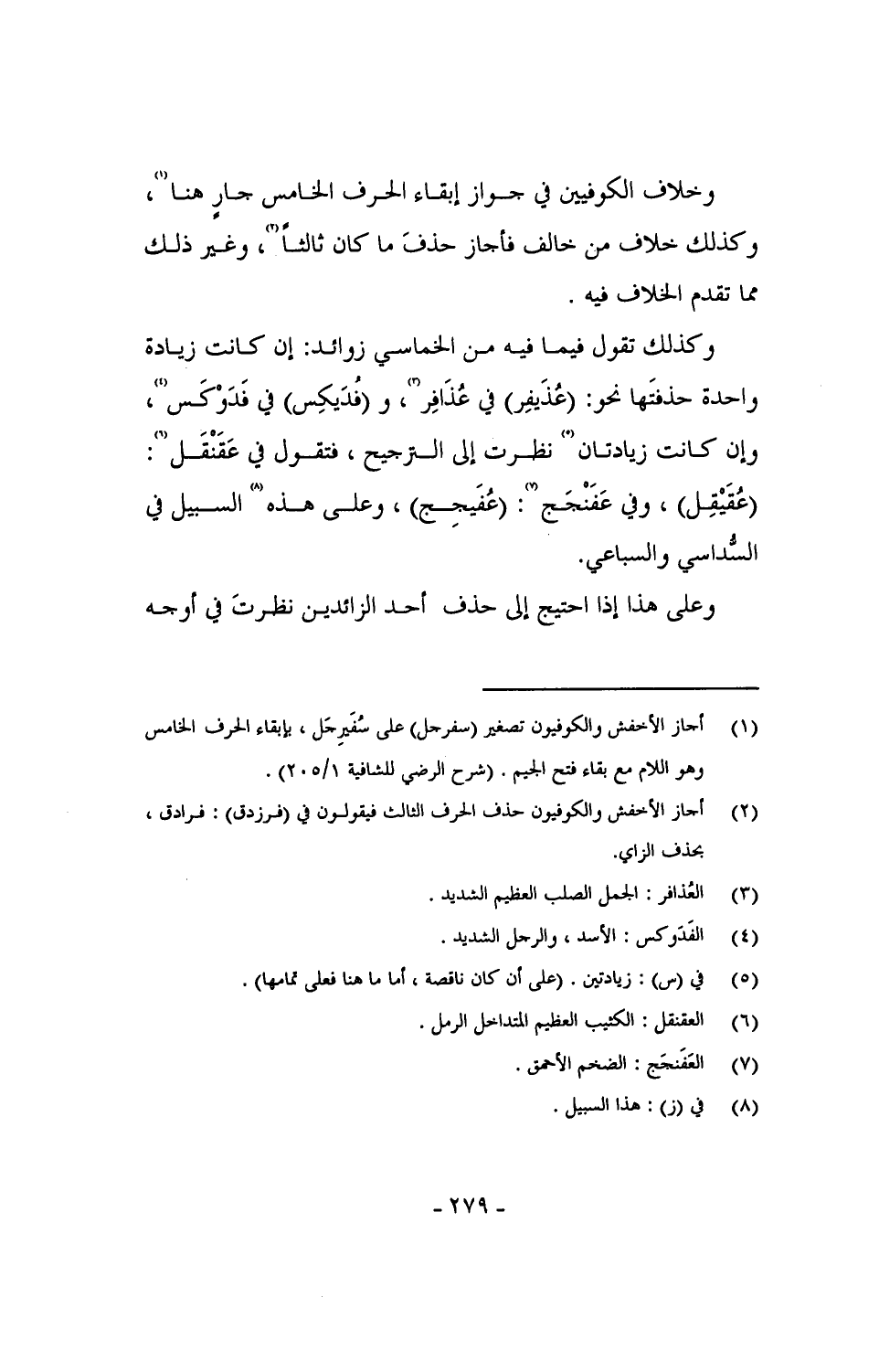 وكذلك تقول فيما فيه من الخماسي زوائد: إن كانت زيادة واحدة حذفتها نحو: (عُذَيْفر) في عذافر، و (فُدَيكس) في فَدَوْكَس، وإن كانت زيادتان نظرت إلى الترجيح، فتقول في عَقَنْقَل: (عُقَيْقِل)، وفي عَفَنْجَج: (عُفَيجِج)، وعلى هذه السبيل في السداسي والسباعي.