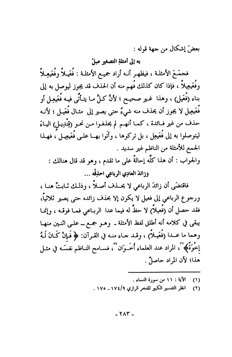فاقتضى أن زائد الرباعي لا يحذف أصلاً، وذلك ثابتٌ هنا، ورجوع الرباعي إلى فعيل لا يكون إلا يحذف زائده حتى يصير ثلاثياً، فقد حصل أن (فُعيلاً) لا حظَّ له فيما عدا الرباعي فما فوقه، وإنما يبقى في كلامه أنه أطلق لفظ الأمثلة - وهو جمع - على اثنين منها وهما ما عدا (فُعَيلاً)، وقد جاء منه في القرآن: {فإنْ كانَ له إخوة}، المراد عند العلماء أخَوَان، فسامح الناظم نفسه في مثل هذا؛ لأن المراد حاصلٌ.