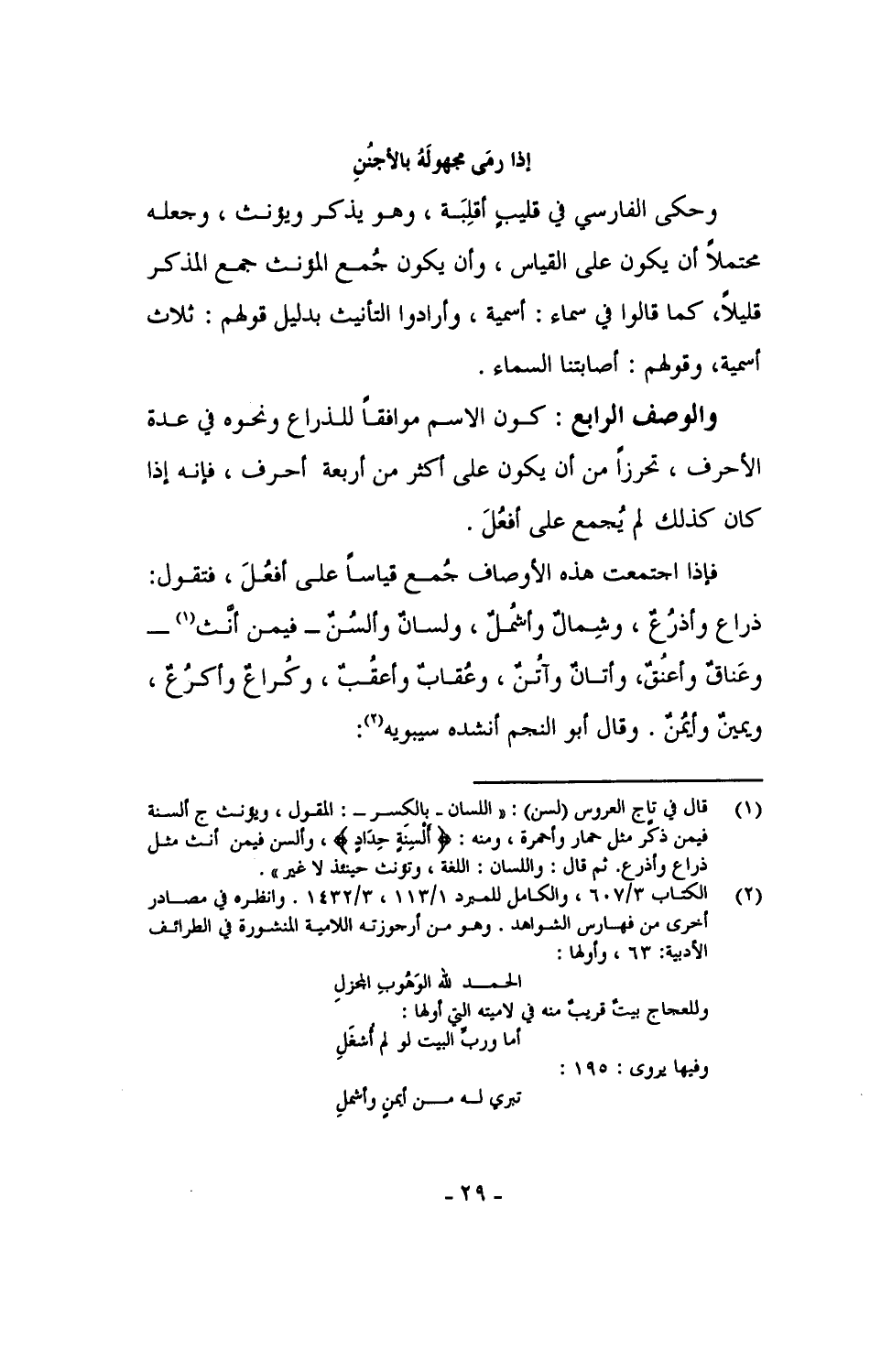 فإذا اجتمعت هذه الأوصاف قياساً على أفعُلَ، فتقول: ذراع وأذرُعٌ، وشمال وأشمُلٌ، ولسان وألسُنٌ - فيمن أنَّث - وعناقٌ وأعنُقٌ، وأتانٌ وآتُنٌ، وعقابٌ وأعقُبٌ، وكُراعٌ وأكرُعٌ، ويمينٌ وأيمُنٌ. وقال أبو النجم أنشده سيبويه: