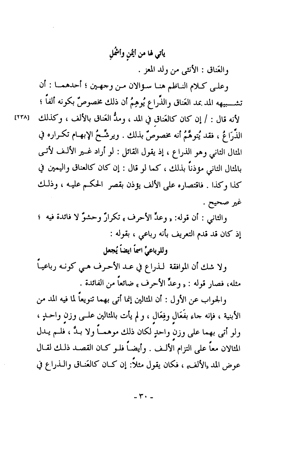 والجواب عن الأول: أن المثالين إنما أتى بهما تنويعاً لما فيه المد من الأبنية، فإنه جاء بفَعَالٍ وفِعَالٍ، ولم يأت بالمثالين على وزنٍ واحدٍ، ولو أتى بهما على وزنٍ واحدٍ لكن ذلك موهماً ولا بدَّ، فلم يدل المثالان معاً على التزام الألف. وأيضاً فلو كان القصد ذلك لقال عوض المد "الألف" فكان يقول مثلاً: إن كان كالعناق والذراع في