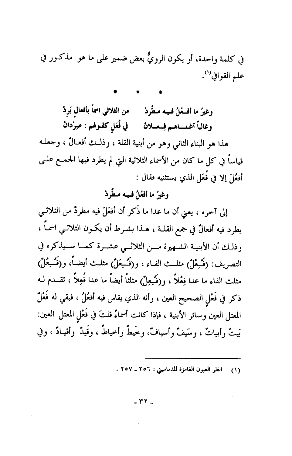 إلى آخره، يعني أن ما عدا ما ذَكر أن أفعَلَ فيه مطردٌ من الثلاثي يطرد في أفعالٌ في جمع القلة، هذا بشرط أن يكون الثلاثي اسماً، وذلك أن الأبنية الشهيرة من الثلاثي اسماً، وذلك أن الأبنية الشهيرة من الثلاثي عشرة كما سيذكره في النصريف: (فعل) مثلث الفاء، و (فعل) مثلث أيضاً، و (فعل) مثلث الفاء ما عدا فِعُلاً، و (فعل) مثلثاً أيضاً ما عدا فُعِلاً، تقدم له ذكر في فَعْلٍ الصحيح العين، وأنه الذي يقاس فيه أفعُلُ، فبقي له فَعْلٌ المعتل العين وسائر الأبنية، فإذا كانت أسماءً قلت في فَعْلٍ المعتل العين: بيتٌ وأبياتٌ، وسيفٌ وأسيافٌ، وخيطٌ وأخياطٌ، وقيدٌ وأقيادٌ، وفي
