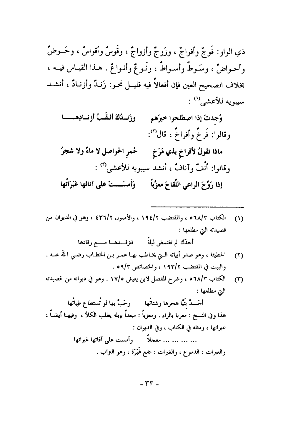 ذي الواو: فرجٌ وأفواجٌ، وزوجٌ وأزواجٌ، وقوسٌ وأقواسٌ، وحوضٌ وأحواضٌ، وسوطٌ وأسواطٌ، ونوعٌ وأنواعٌ. هذا القياس فيه، بخلاف الصحيح العين فإن أفعالاً فيه قليل نحو: زندٌ وأزنادٌ، أنشد سيبويه للأعشى: