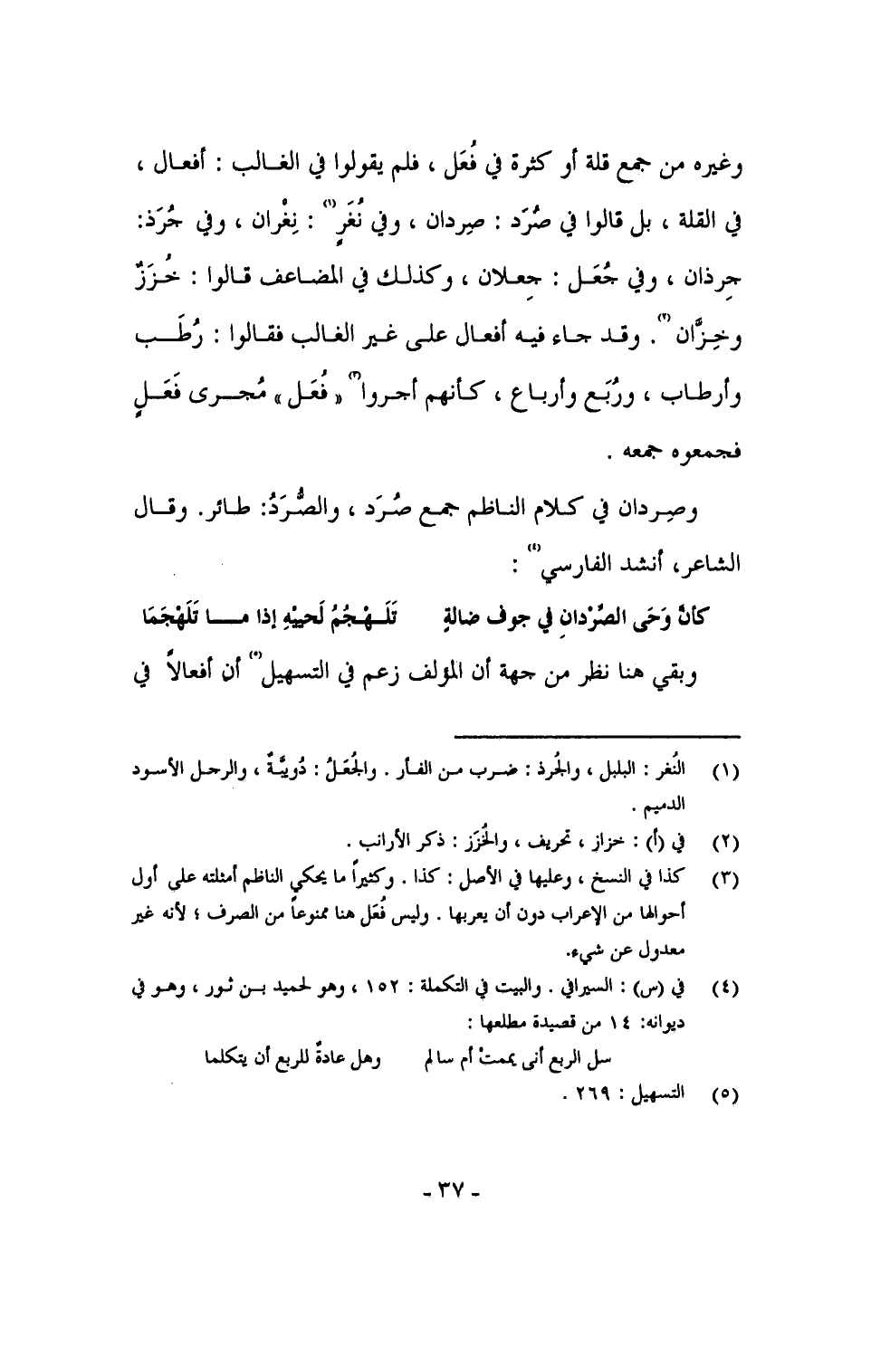وغيره من جمع قلة أو كثيرة في فُعَل، فلم يقولوا في الغالب: أفعال، في القلة، بل قالوا في صُرَد: صِردان، وفي نُغَرٍ: نِغران، وفي جُرَذ: جِرذان، وفي جُعَل: جِعلان، وكذلك في المضاعف قالوا: خُزَزٌ وخِزَّان. وقد جاء في أفعال على غير الغالب فقالوا: رُطَب وأرطاب، ورُبَع وأرباع، كأنهم أجروا "فُعَل" مُجرى فَعَلٍ فجمعوه جمعه.