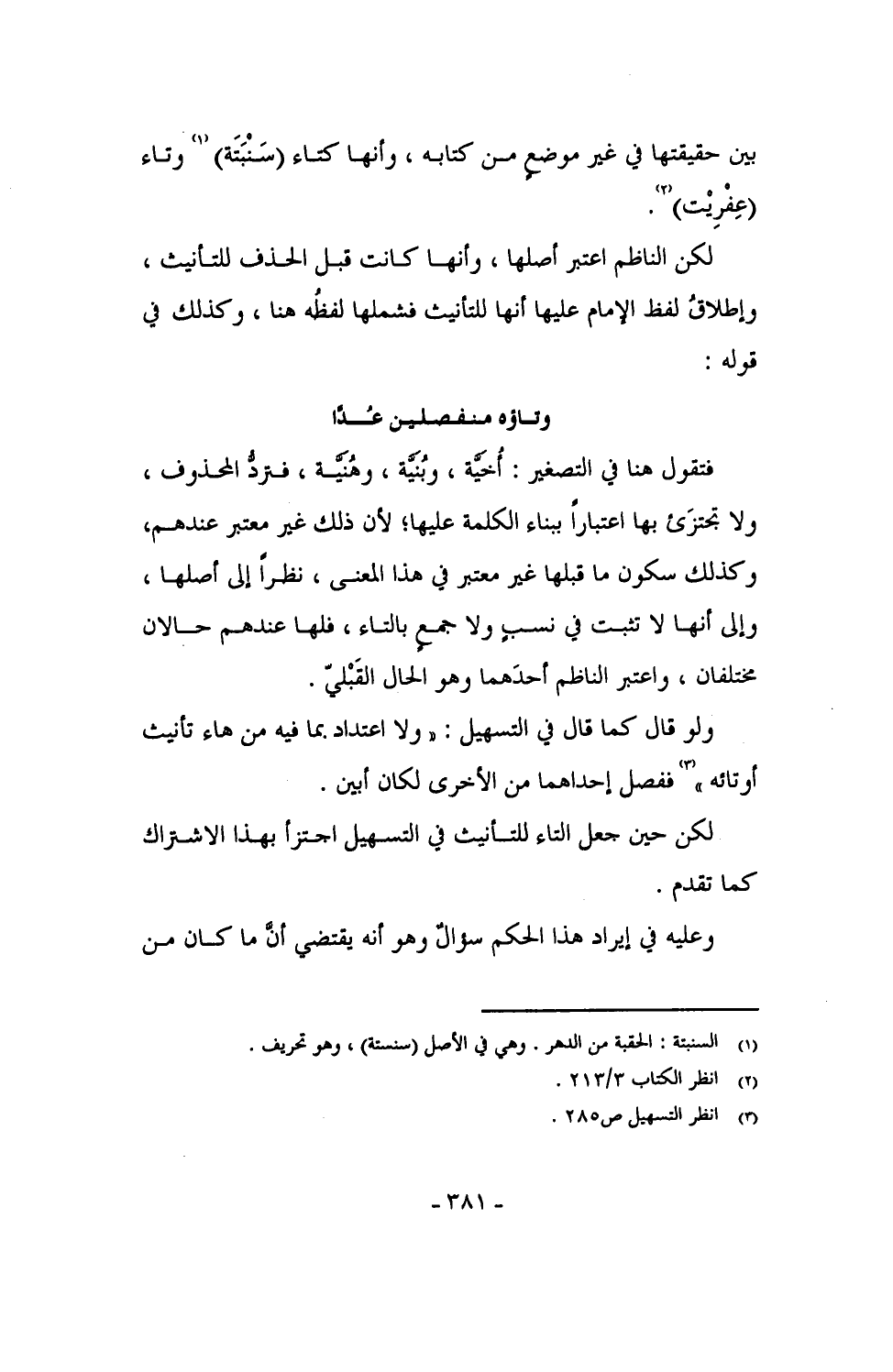 فتقول هنا في التصغير: أُخَيَّة، وبُنَيَّة، وهُنَيَّة، فتردُّ المحذوف، ولا تجتزَئ بها اعتباراً ببناء الكلمة عليها؛ لأن ذلك غير معتبر عندهم، وكذلك سكون ما قبلها غير معتبر في هذا المعنى، نظراً إلى أصلها، وإلى أنها لا تثبت في نسبٍ ولا جمعٍ بالتاء، فلها عندهم حالان مختلفان، واعتبر الناظم أحدهما وهو الحال القَبْليَ.