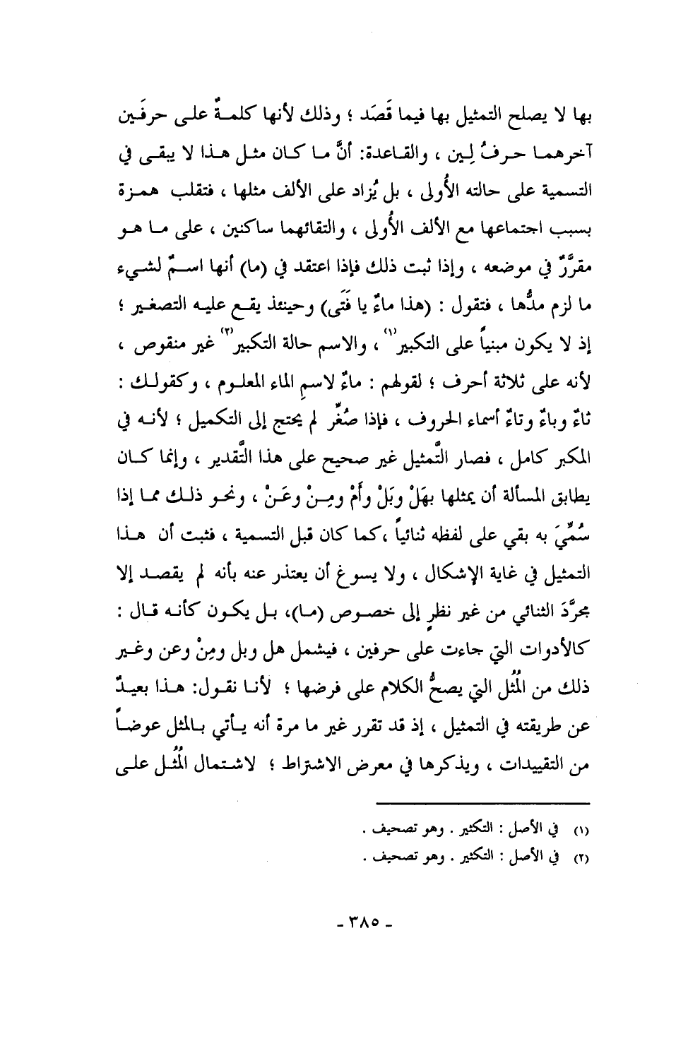 بها لا يصلح التمثيل بها فيما قصد، وذلك لأنها كلمة على حرفين آخرهما حرفُ لين، والقاعدة: أنَّ كل ما كان مثل هذا لا يبقى في التسمية على حالته الأولى، بل يزاد على ألف مثلها، فتقلب همزة بسبب اجتماعها مع الألف الأولى، والتقائهما ساكنين، على ما هو مقرر في موضعه، وإذا ثبت ذلك فإذا اعتقد في (ما) أنها اسمٌ لشيء ما لزم مدُّها، فتقول: (هذا ماءٌ يا فتى) وحينئذ يقع عليه التصغير؛ إذ لا يكون مبنياً على التكبير، والاسم حالة التكبير غير نقوص، لأنه على ثلاثة أحرف؛ لقولهم: ماءٌ لاسمِ الماء المعلوم، وكقولك: ثاءٌ وباءٌ وتاءٌ أسماء الحروف، فإذا صُغِّر لم يحتج إلى التكميل؛ لأنه في المكبر كامل، فصار التمثيل غير صحيح على هذا التقدير، وإنما كان يطابق المسألة أن يمثلها بهَلْ وبَلْ وأَمْ ومِنْ وعَنْ، ونحو ذلك مما إذا سمي به بقي على لفظه ثنائياً، كما كان قبل التسمية، فثبت أن هذا التمثيل في غاية الإشكال، ولا يسوغ أن يعتذر عنه بأنه لم يقصد إلا مجرد الثنائي من غير نظرٍ إلى خصوص (ما)، بل يكون كأنه قال: كالأدوات التي جاءت على حرفين، فيشمل هل وبل ومِنْ وعن وغير ذلك من المُثُل التي يصحُّ الكلام على فرضها؛ لأنا نقول: هذا بعيدٌ عن طريقته في التمثيل، إذ قد تقرر غير ما مرة أنه يأتي بالمثل عوضاً من التقييدات، ويذكرها في معرض الاشتراط؛ لاشتمال المُثُل على