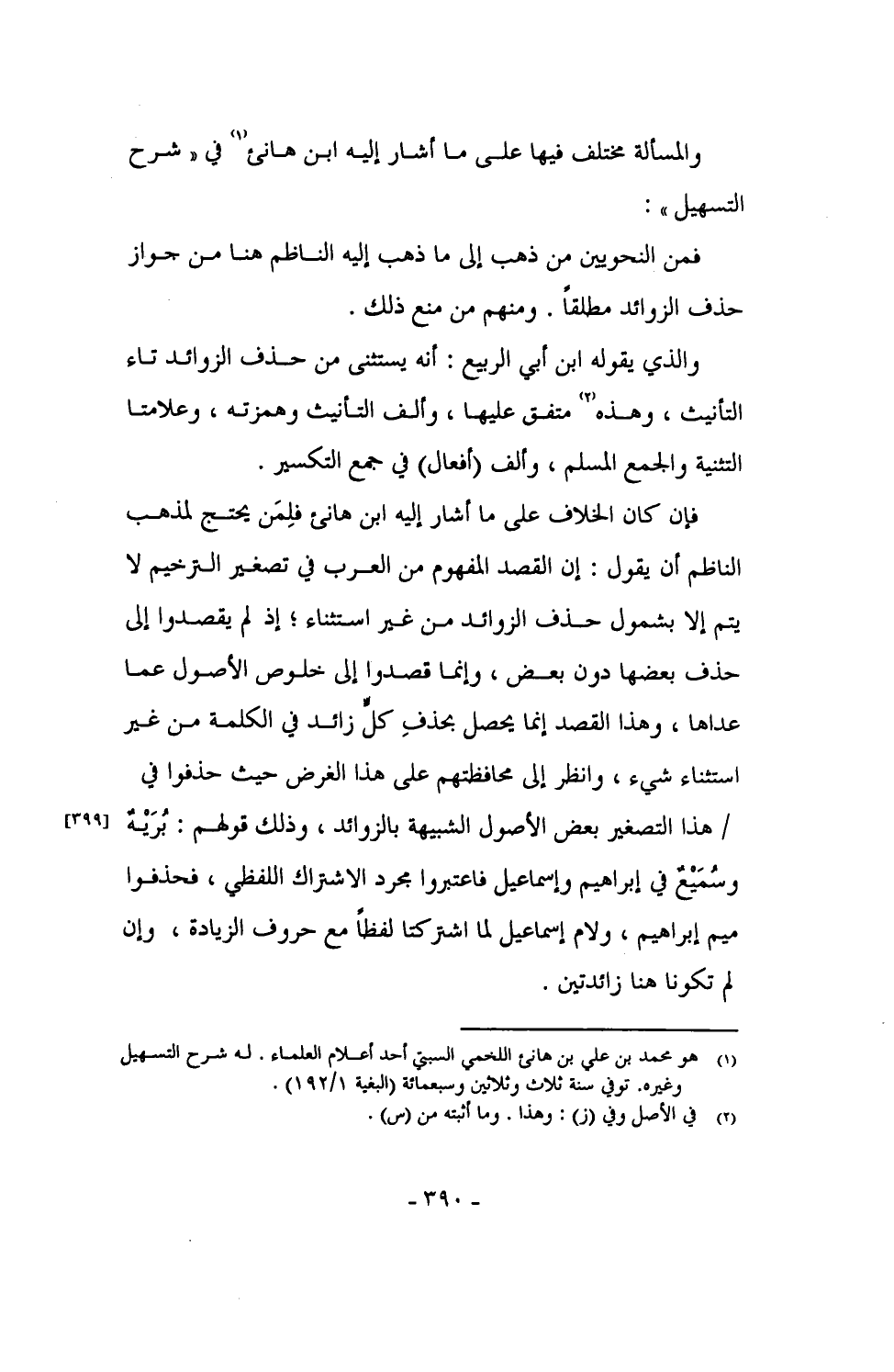 فإن كان الخلاف على ما أشار إليه ابن هانئ فلِمَن يحتج لمذهب الناظم أن يقول: إن القصد المفهوم من العرب في تصغير الترخيم لا يتم إلا بشمول حذف الزوائد من غير استثناء؛ إذ لم يقصدوا إلى حذف بعضها دون بعض، وإنما قصدوا إلى خلوص الأصول عما عداها، وهذا القصد إنما يحصل بحذفِ كل زائد في الكلمة من غير استثناء شيء، وانظر إلى محافظتهم على هذا الغرض حيث حذفوا في / هذا التصغير بعض الأصول الشبيهة بالزوائد، وذلك قولهم: بُرَيْهٌ وسُمَيْعٌ في إبراهيم وإسماعيل فاعتبروا مجرد الاشتراك اللفظي، فحذفوا ميم إبراهيم، ولام إسماعيل لما اشتركتا لفظاً مع حروف الزيادة، وإن لم تكونا هنا زائدتين.