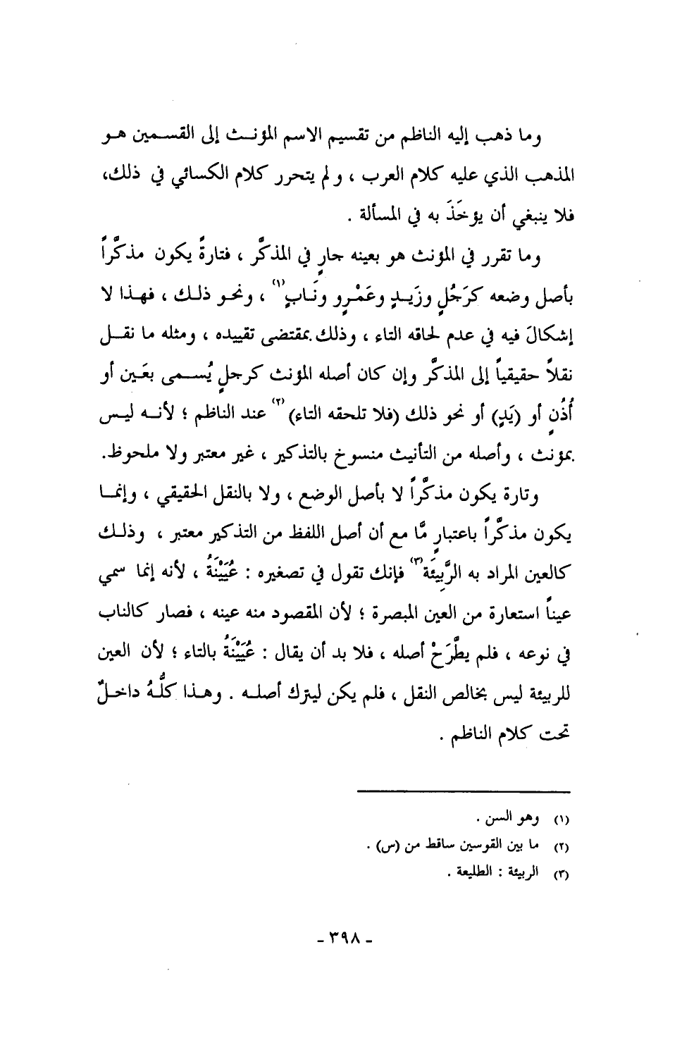 وتارة يكون مذكراً لا بأصل الوضع، ولا بالنقل الحقيقي، وإنما يكون مذكراً باعتبار مَّا مع أن أصل اللفظ من التذكير معتبر، وذلك كالعين المراد به الرَّبِيئة فإنك تقول في تصغيره: عُيَيْنَة، لأنه إذا سمي عينا استعارة من العين المبصرة؛ لأن المقصود منه عينه، لأنه إنما سمي عيناً استعارة من العين المبصرة؛ لأن المقصود منه عينه، فصار كالناب في نوعه، فلم يطَّرَحْ أصله، فلا بد أن يقال: عُيَيْنَةُ بالتاء؛ لأن العين للربيئة ليس بخالص النقل، فلم يكن ليترك أصله. وهذا كله داخل تحت كلام الناظم.