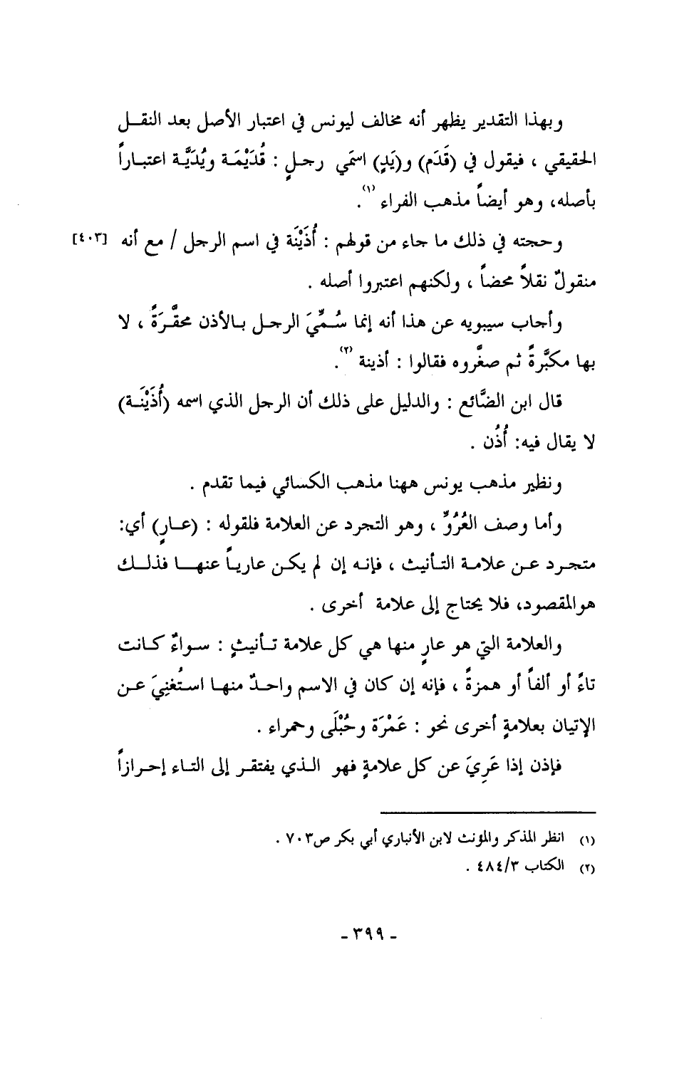 قال ابن الضائع: والدليل على ذلك أن الرجل الذي اسمه (أُذَيْنَة) لا يقال فيه: أُذُن.