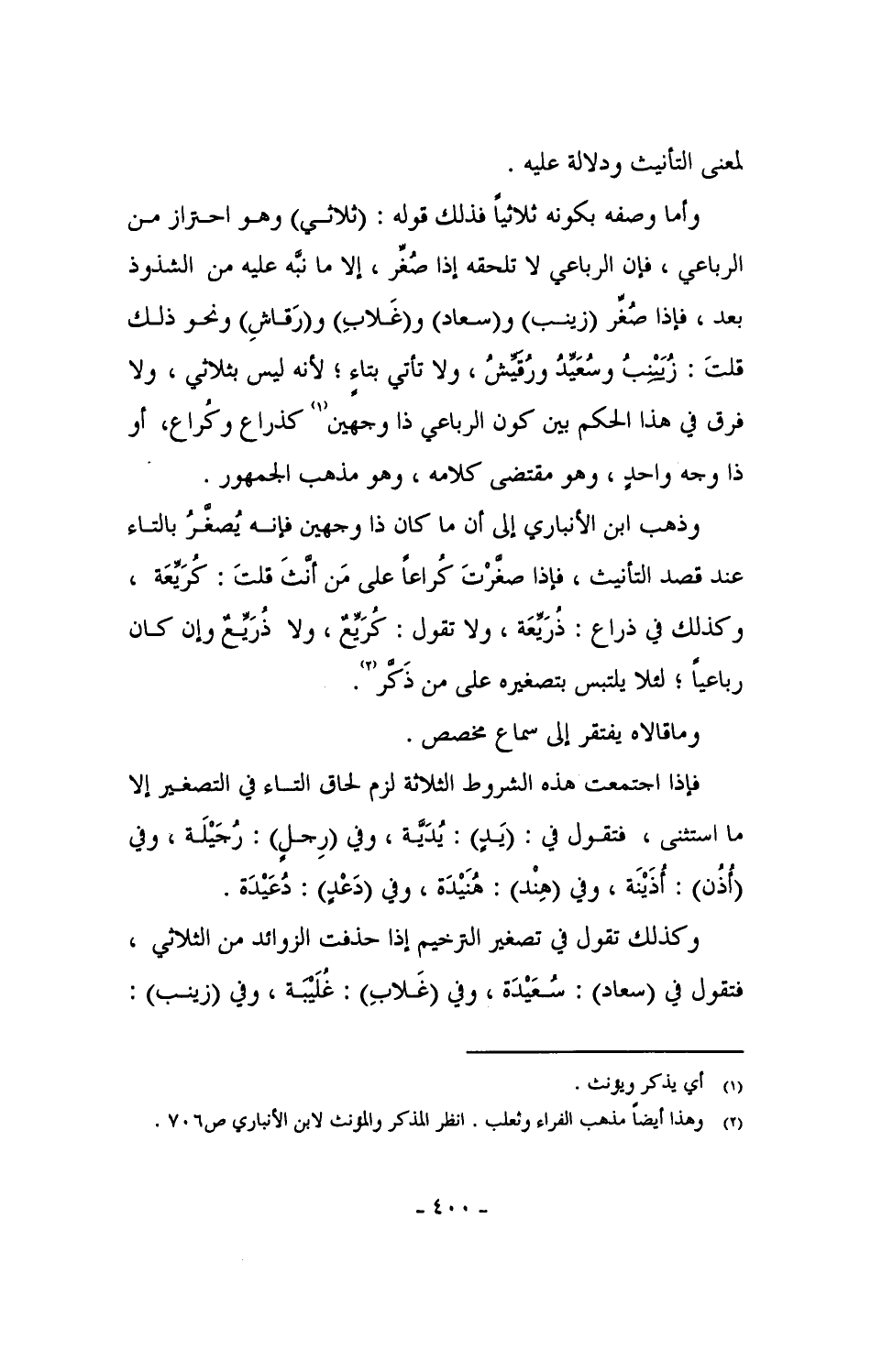 وذهب ابن الأنباري إلى أن ما كان ذا وجهين فإنه يُصَغَّرُ بالتاء عند قصد التأنيث، فإذا صغَّرتَ كُراعاً على من أنَّث قلتَ: كُرَيِّعَة، وكذلك في ذراع: ذُرَيِّعَة، ولا تقول: كُرَيِّعٌ، ولا ذُرَيِّعٌ وإن كان رباعياً؛ لئلا يلتبس بتصغيره على ما ذَكَّر.