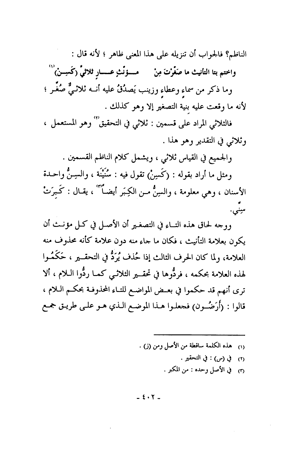 واختمْ بتا التأنيث ما صغَّرتَ من مؤنثٍ عارٍ ثلاثي (كَسِنْ)