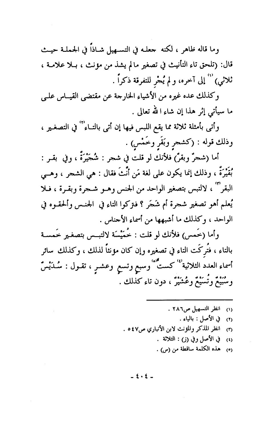 وأما (خَمس) فلأنك لو قلت: خُمَيْسة لالتبس بتصغير خمسة بالتاء، فتركت التاء في تصغيره وإن كان مؤنثاً لذلك، وكذلك سائر أسماء العدد الثلاثية كستٍّ وسبعٍ وتسعٍ وعشرٍ، تقول: سُدَيْسٌ وسُبَيْعٌ وتُسَيْعٌ وعُشَيرٌ، دون تاء كذلك.