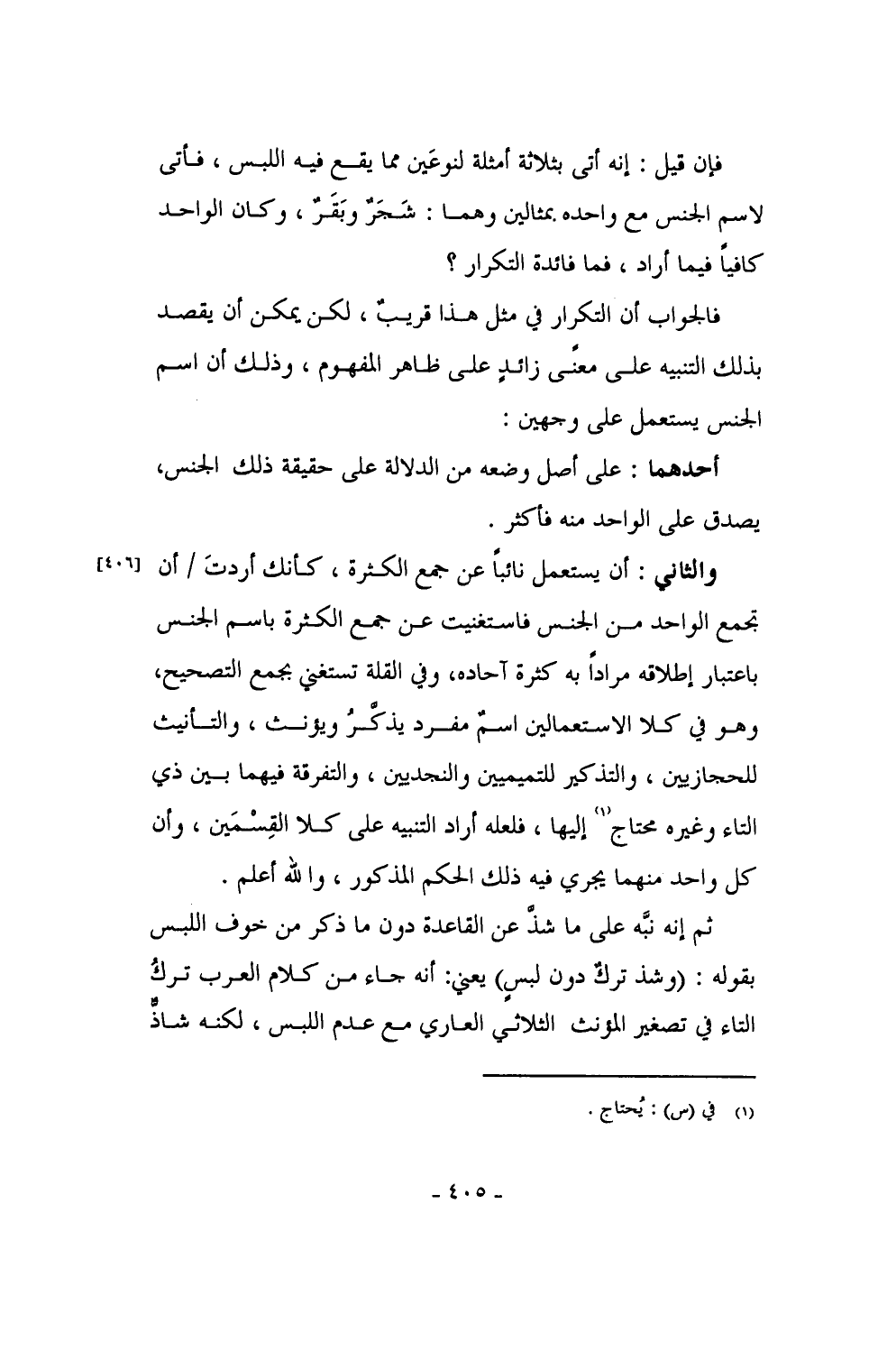 والثاني: أن يستعمل نائباً عن جمع الكثرة، كأنك أردتَ / أن تجمع الواحد من الجنس فاستغنيت عن جمع الكثرة باسم الجنس باعتبار إطلاقه مراداً به كثرة آحاده، وفي القلة تستغني بجمع التصحيح، وهو في كلا الاستعمالين اسم مفرد يذكر ويؤنث، والتأنيث للحجازيين، والتذكير للتميميين والنجديين، والتفرقة فيهما بين ذي التاء وغيره محتاج إليها، فلعله أراد التنبيه على كلا القسمين، وأن كل واحد منهما يجري فيه ذلك الحكم المذكور، والله أعلم.