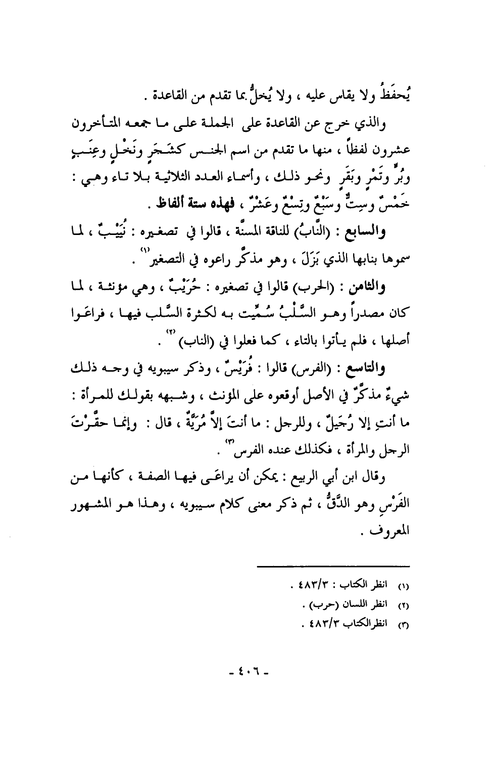 والثامن: (الحرب) قالوا في تصغيره: حُرَيْب، وهي مؤنثة، لما كان مصدراً وهو السَّلْب سُمِّيت به لكثرة السلب فيها، فراعَوا أصلها، فلم يأتوا بالتاء، كما فعلوا في (الناب).