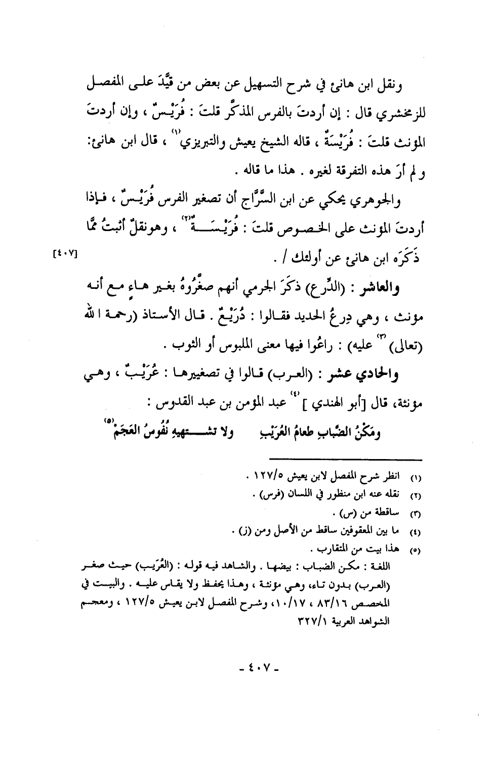 والحادي عشر: (العرب) قالوا في تصغييرها: عُرَيْبٌ، وهي مؤنثة، قال [أبو الهندي] عبدالمؤمن بن عبدالقدوس: