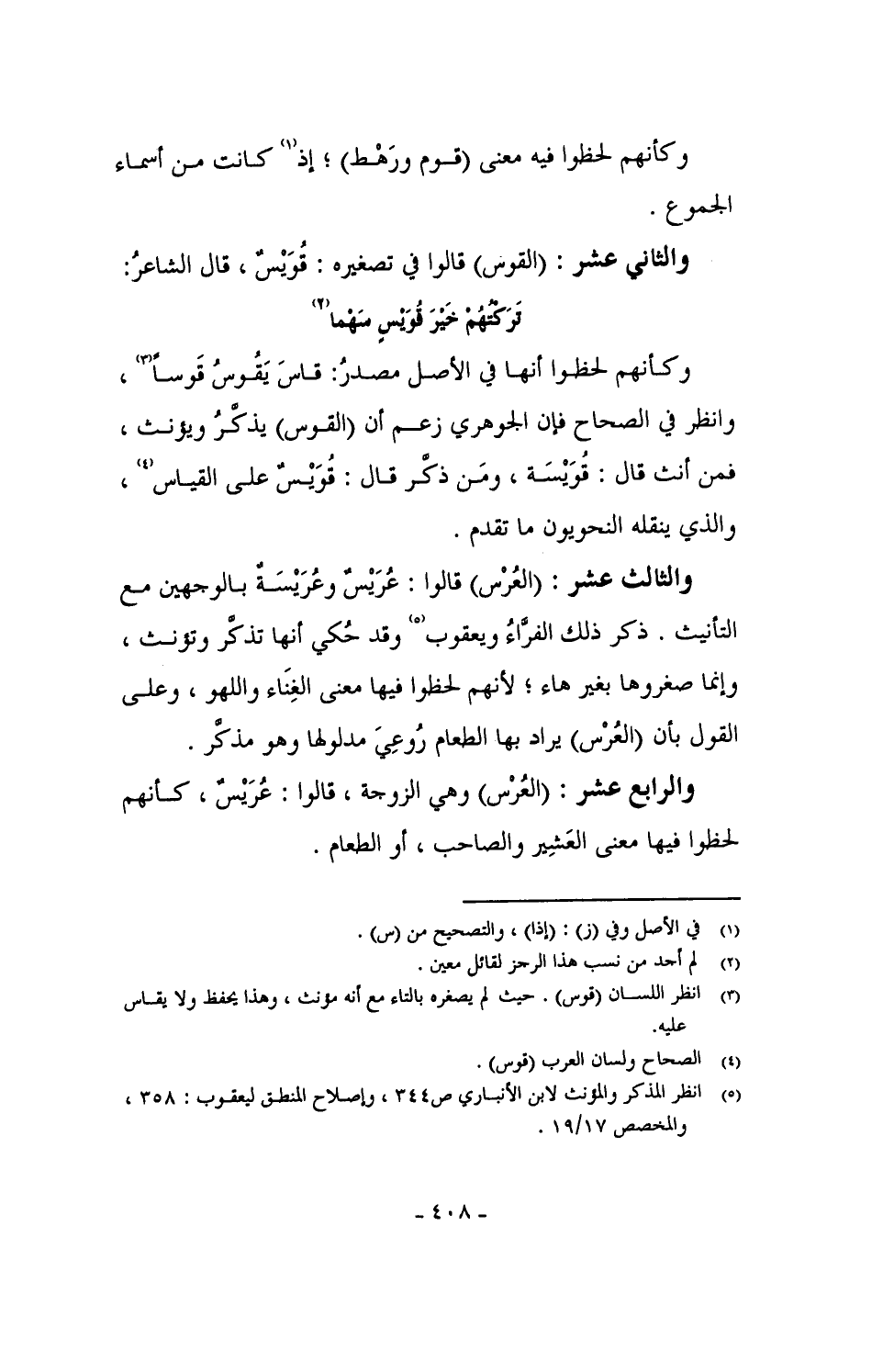 والثاني عشر: (القوس) قالوا في تصغيره: قُوَيْسٌ، قال الشاعر: