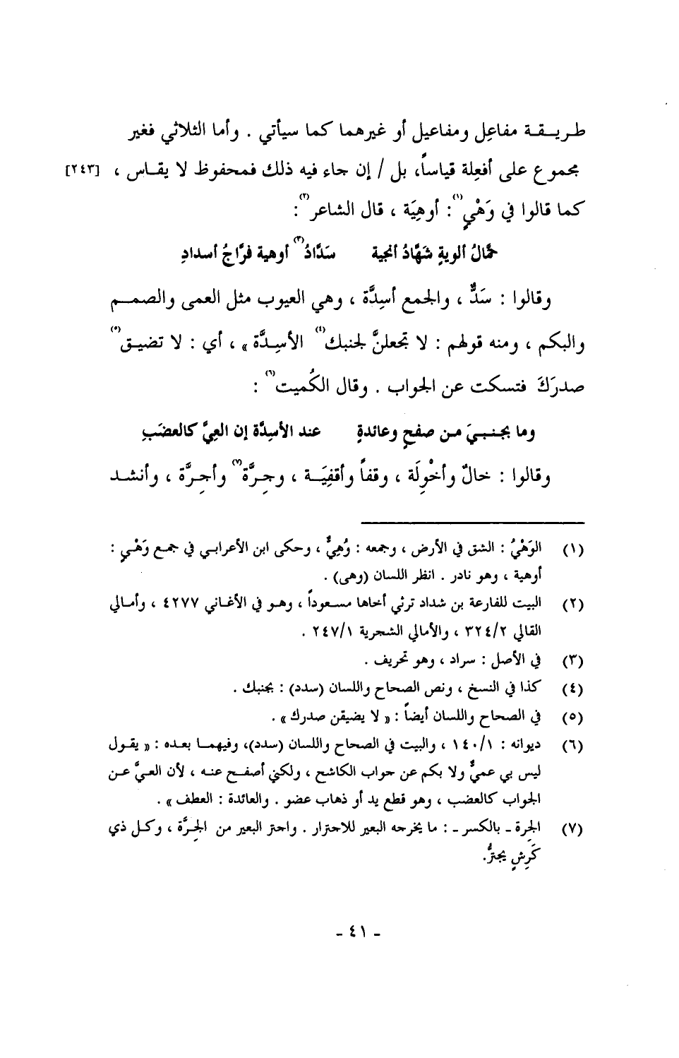طريقة مفاعِل ومفاعيل أو غيرهما كما سيأتي. وأما الثلاثي فغير مجموع على أفعِلة قياساً، بل / إن جاء فيه ذلك فمحفوظ لا يقاس، كما قالوا في وَهْيٍ: أوهِيَة، قال الشاعر: