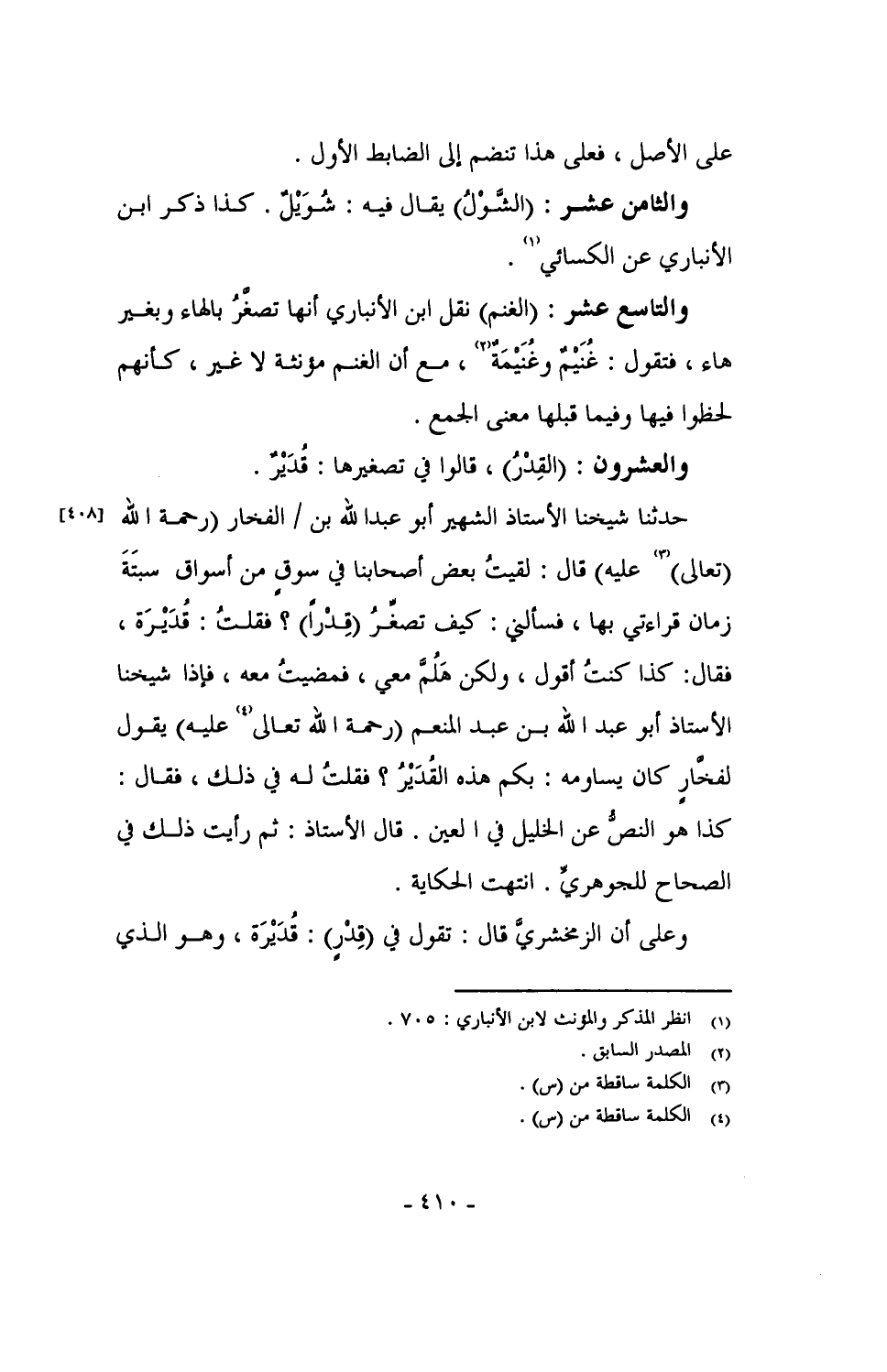 حدثنا شيخنا الأستاذ الشهير أبو عبدالله بن / الفخار (رحمة الله (تعالى) عليه) قال: لقيتُ بعض أصحابنا في سوق من أسواق سبتة زمان قراءتي بها، فسألني: كيف تصغَّر (قِدْراً)؟ فقلتُ: قُدَيْرَة، فقال: كذا كنت أقول، ولكن هَلُمَّ معي، فمضيت معه، فإذا شيخنا الأستاذ أبو عبدالله بن عبدالمنعم (رحمة الله تعالى عليه) يقول لفخَّارٍ كان يساومه: بكم هذا القُدَيْرُ؟ فقلتُ له في ذلك، فقال: كذا هو النص عن الخليل في العين. قال الأستاذ: ثم رأيت ذلك في الصحاح للجوهريِّ. انتهت الحكاية.