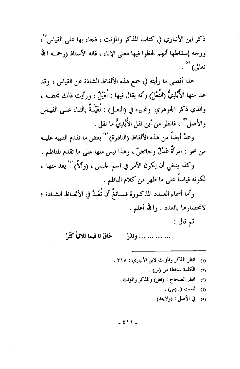 هذا أقصى ما رأيته في جمع هذه الألفاظ الشاذة عن القياس، وقد عد منها الأُبَّذِيُّ (النَّعْلَ) وأنه يقال فيها: نُعَيْلٌ، ورأيت ذلك بخطه، والذي ذكر الجوهري وغيره في (النعل): نُعَيْلَةٌ بالتاء على القياس والأصل، فانظر من أين نقل الأُبَّذِيُّ ما نقل.