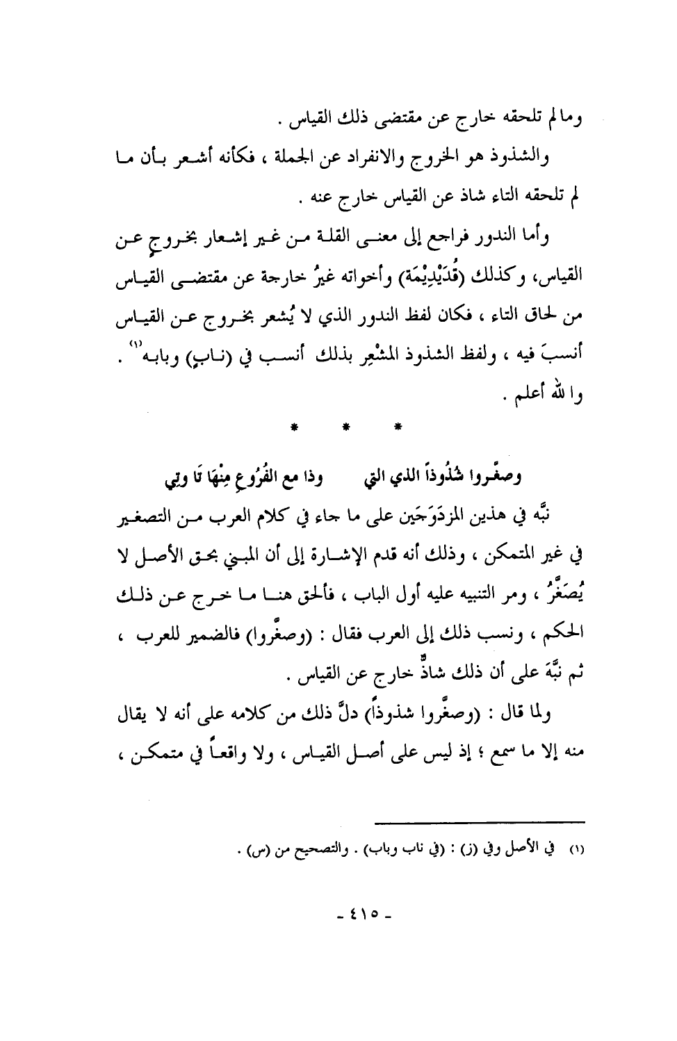 وأما الندور فراجع إلى معنى القلة من غير إشعارٍ بخروجٍ عن القياس؛ وكذلك (قُدَيْدِيْمَة) وأخواته غير خارجة عن مقتضى القياس من لحاق التاء، فكان لفظ الندور الذي لا يُشعر بخروج عن القياس أنسبَ فيه، ولفظ الشذوذ المشعِر بذلك أنسب في (نابٍ) وبابه. والله أعلم.