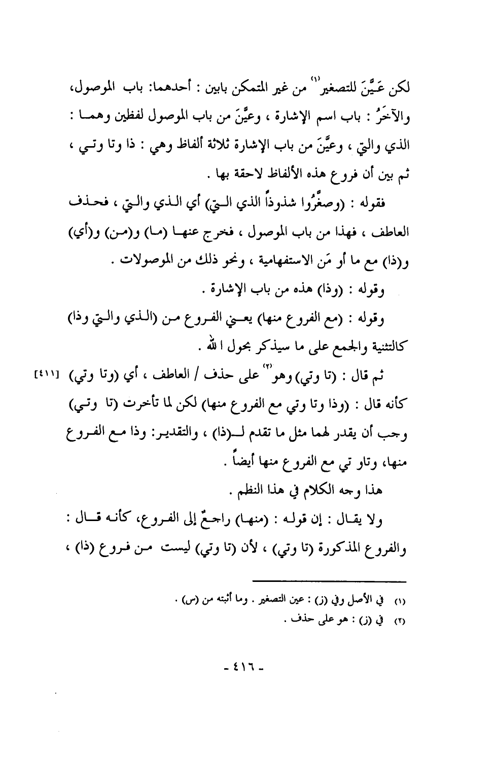 فقوله: (وصغَّروا شذوذاً الذي التي) أي الذي والتي، فحذف العاطف، فهذا من باب الموصول، فخرج عنها (ما) و (من) و (أي) و (ذا) مع ما أو مَن الاستفهامية، ونحو ذلك من الموصولات.