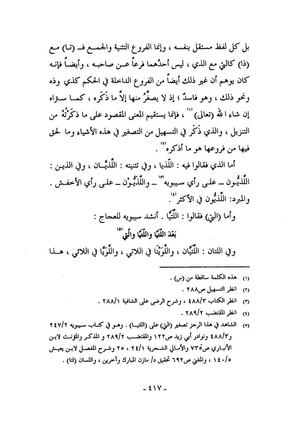 بل كل لفظ مستقل بنفسه، وإنما الفروع التثنية والجمع فـ (تا) مع (ذا) كالتي مع الذي، ليس أحدهما فرعاً عن صاحبه، وأيضاً فإنه كان يوهم أن غير ذلك أيضاً من الفروع الداخلة في الحكم كذي وذه ونحو ذلك، وهو فاسدٌ؛ إذ لا يصغَّرُ منها إلا ما ذكره، كما ستراه إن شاء الله (تعالى)، فإنما يستقيم المعنى المقصود على ما ذكرتُهُ من التنزيل، والذي ذكر في التسهيل من التصغير في هذه الأشياء وما لحق فيها من فروعها هو ما أذكره.