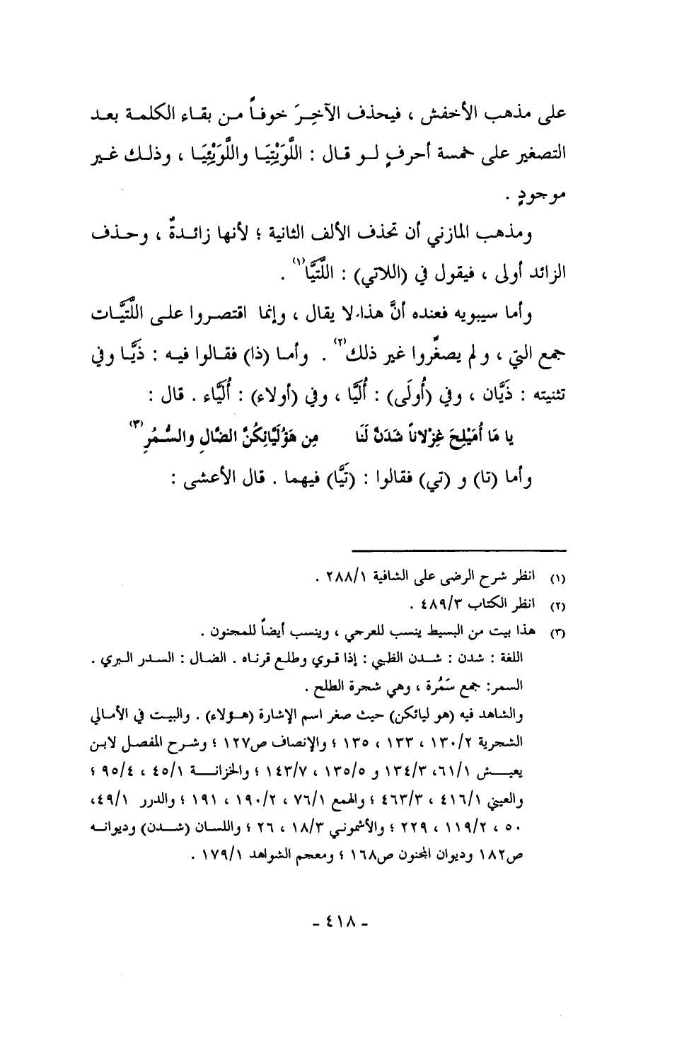 وأما سيبويه فعنده أن هذا لا يقال، وإنما اقتصروا على اللتيَّات جمع التي، ولم يصغِّروا غير ذلك. وأما (ذا) فقالوا فيه: ذَيَّا وفي تثنيته: ذَيَّان، وفي (أُولَى): أُلَيَّا، وفي (أولاء): أُلَيَّاء. قال: