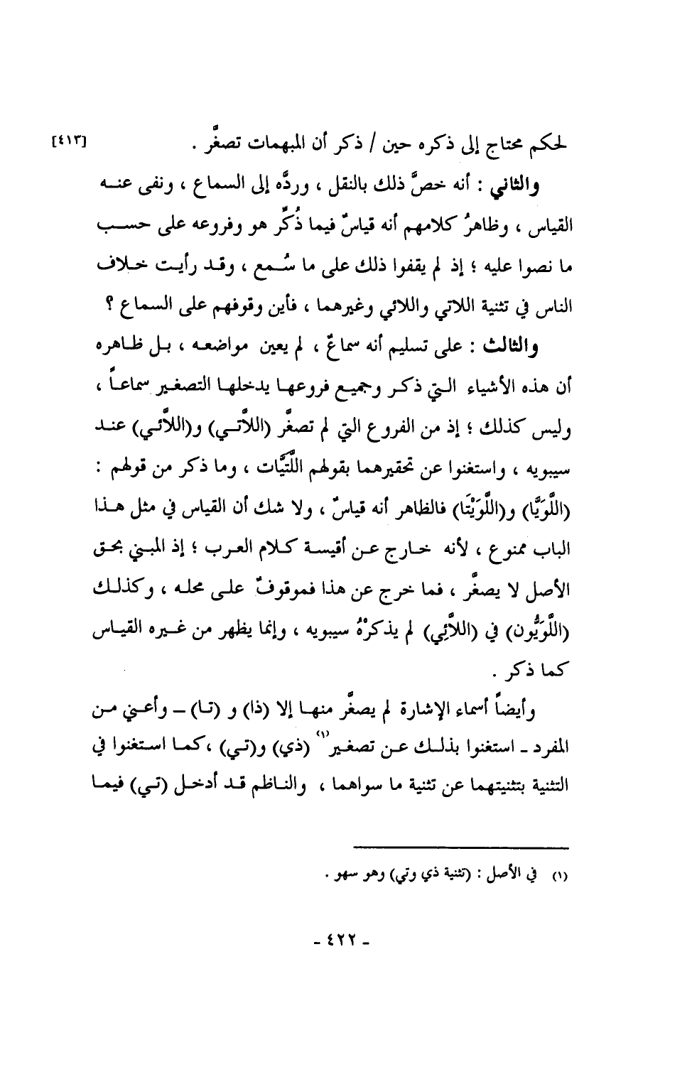 وأيضاً أسماء الإشارة لم يصغر منها إلا (ذا) و (تا) - وأعني من المفرد - استغنوا بذلك عن تصغير (ذي) و (تي)، كما استغنوا في التثنية بتثنيتهما عن تثنية ما سواهما، والناظم قد أدخل (تي) فيما