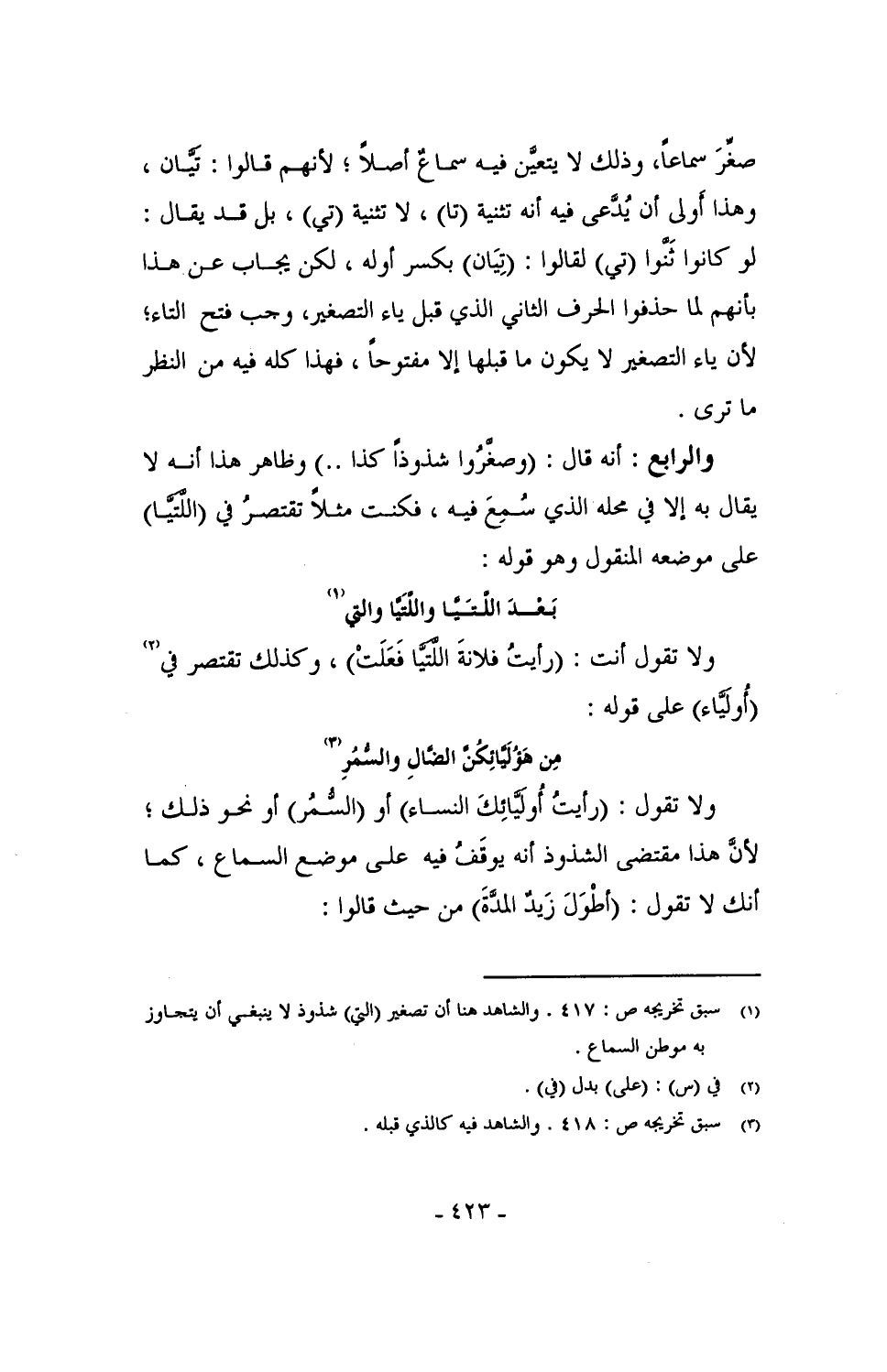 والرابع: أنه قال: (وصغروا شذوذاً كذا .. ) وظاهر هذا أنه لا يقال به إلا في محله الذي سُمِعَ فيه، فكنت مثلاً تقتصرُ في (اللَّتَيَّا) على موضعه المنقول وهو قوله:
