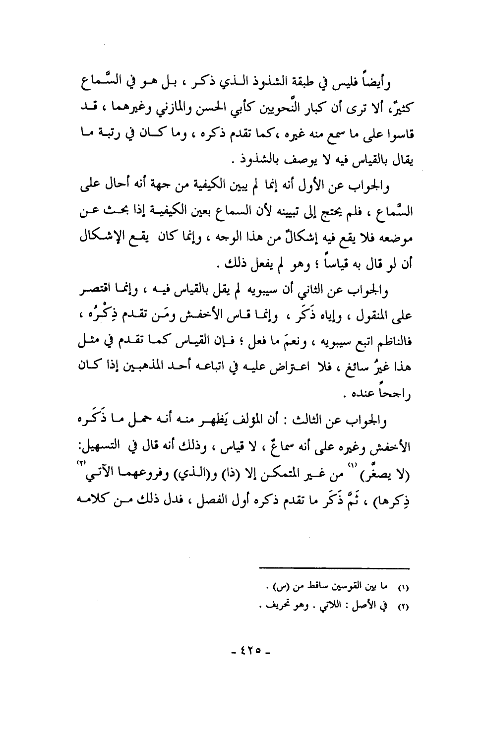 وأيضاً فليس في طبقة الشذوذ الذي ذكر، بل هو في السماع كثيرٌ، ألا ترى أن كبار النحويين كأبي الحسن والمازني وغيرهما، قد قاسوا على ما سمع منه غيره، كما تقدم ذكره، وما كان في رتبة ما يقال بالقياس فيه لا يوصف بالشذوذ.