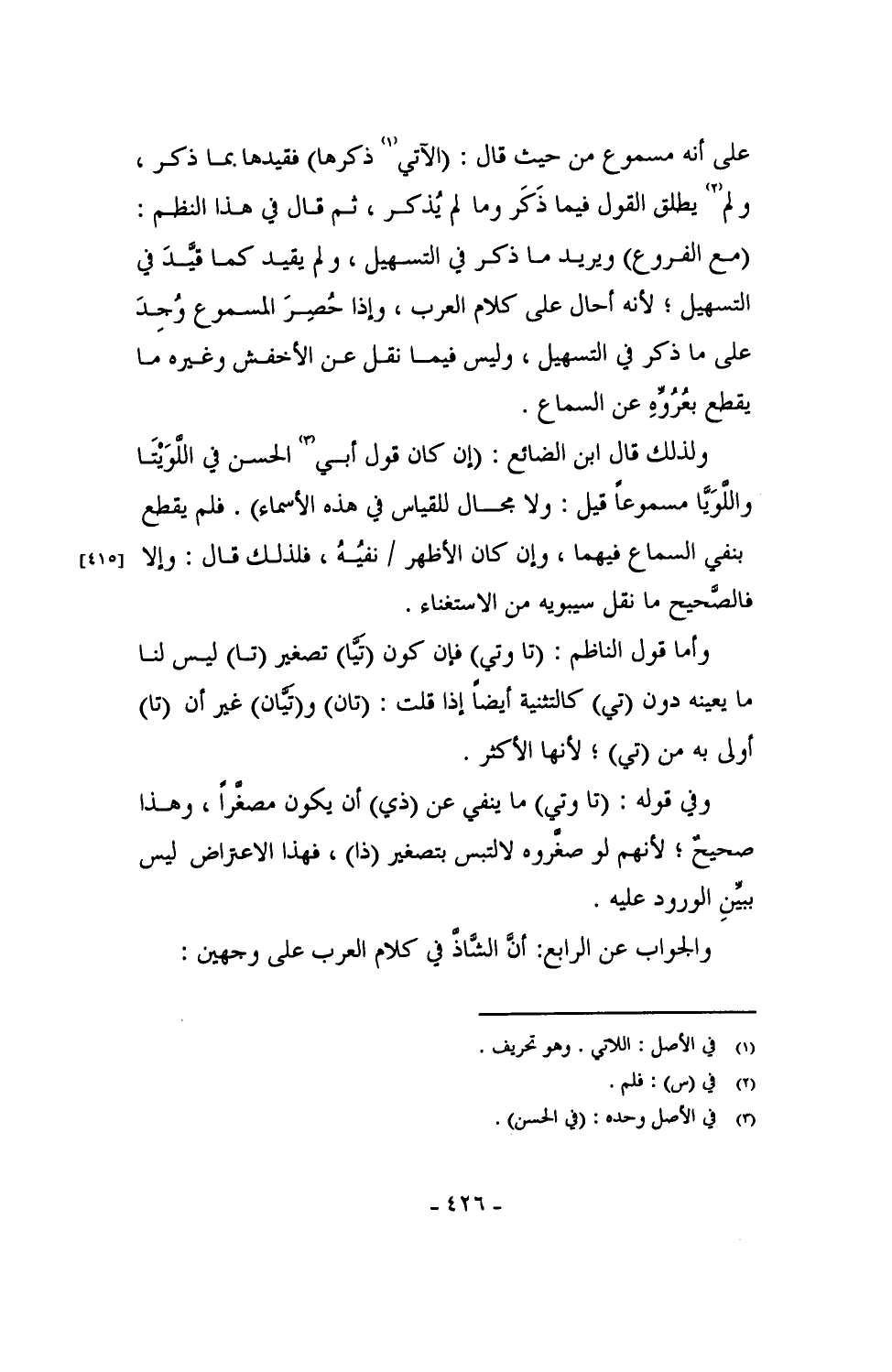 وفي قوله: (تا وتي) ما ينفي عن (ذي) أن يكون مصغراً، وهذا صحيح؛ لأنهم لو صغروه لالتبس بتصغير (ذا)، فهذا الاعتراض ليس ببيِّنِ الورود عليه.