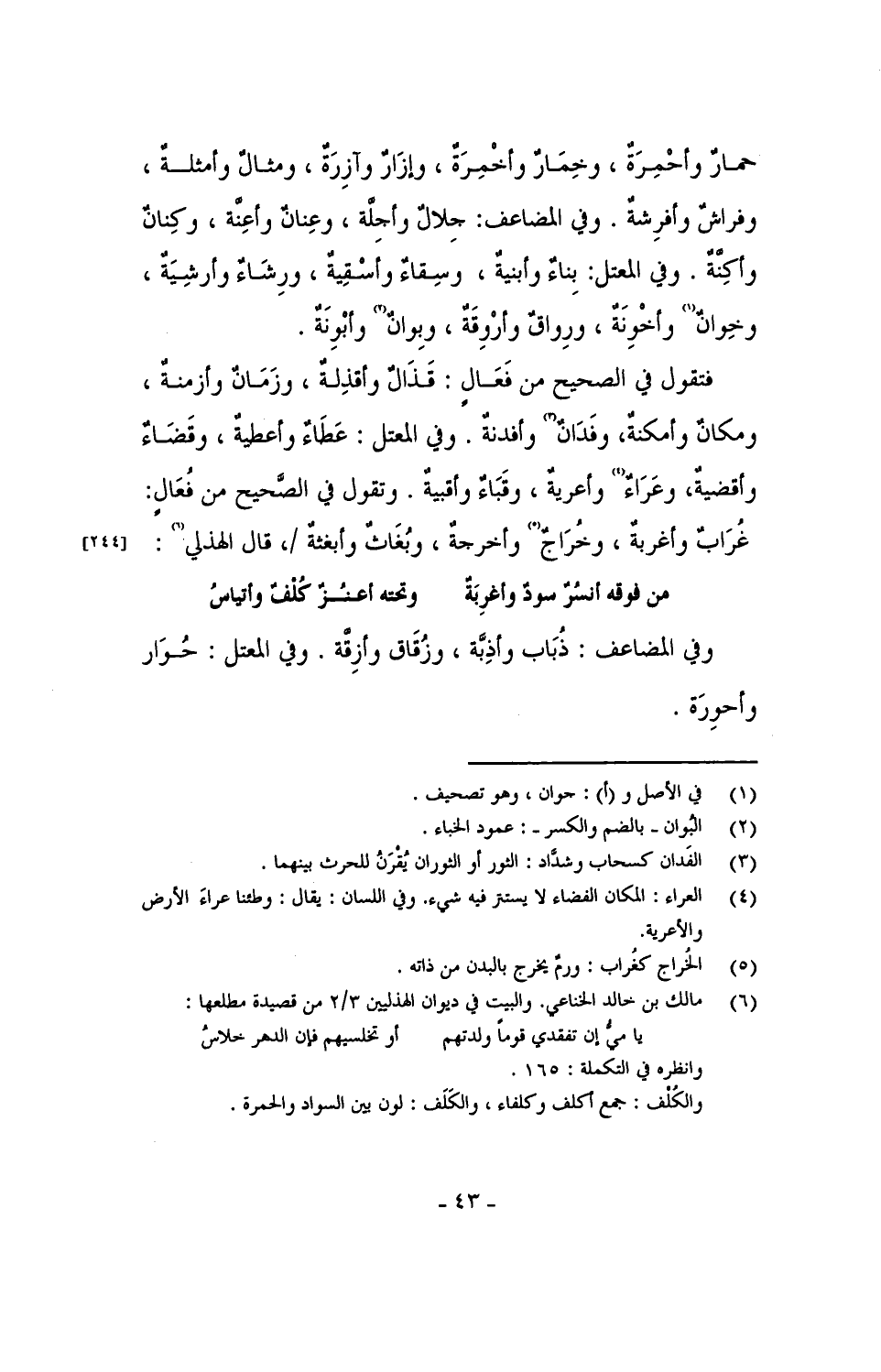 فتقول في الصحيح من فَعَالٍ: قَذَالٌ وأقذِلة، وزمان وأزمنة، ومكان وأمكنة، وفدان وأفدنة. وفي المعتل: عطاءٌ وأعطية، وقضاء وأقضية، وعراء وأعرية، وقباء وأقبية. وتقول في الصحيح من فُعَال: غُرَاب وأغربة، وخُرَاج وأخرجة، وبغاث وأبغثة /، قال الهذلي: