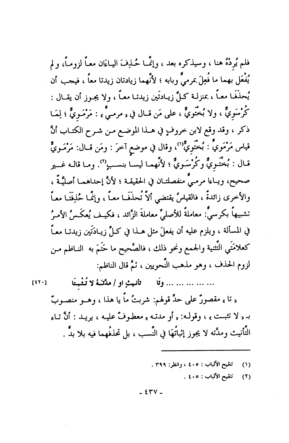 فلم يُرِدْهُ هنا، وسيذكره بعد، وإنما حُذِفَ الياءان معاً لزوماً، ولم يُفعل بهما ما فُعل بمرميٍّ وبابه؛ لأنهما زيادتان معاً، فيجب أن يحذفا معاً، بمنزلة كل زيادتين زيدتا معاً، ولا يجوز أن يقال: كُرْسَويٌّ، بُخْتَويٌّ، على من قال في "مرمي"/ مَرْمَوِيٌّ؛ لما ذكر، وقد وقع لابن خروف في هذا الموضع من شرح الكتاب أن قياس مَرْمَوِيّ: بُخْتَويّ، وقال في موقع آخر: ومن قال: مَرْمَويّ قال: بُختويٌّ وكُرْسَويٌّ؛ لأنهما ليسا بنسب. وما قاله غير صحيح، وياءا مرميٍّ منفصلتان في الحقيقة؛ لأن إحداهما أصلية، والأخرى زائدة، فالقياس يقتضي ألا تُحذفا معاً، وإنما حذفتا معاً تشبيهاً بكرسيٍّ: معاملة للأصلي معاملة الزائد، فكيف يُعْكس الأمر في المسألة، ويلزم عليه أن يفعلَ مثل هذا في كل زيادتين زيدتا معاً كعلامي التثنية والجمع ونحو ذلك، فالصحيح ما حَتَمَ بع الناظم من لزوم الحذف، وهو مذهب النحويين، ثم قال الناظم:
