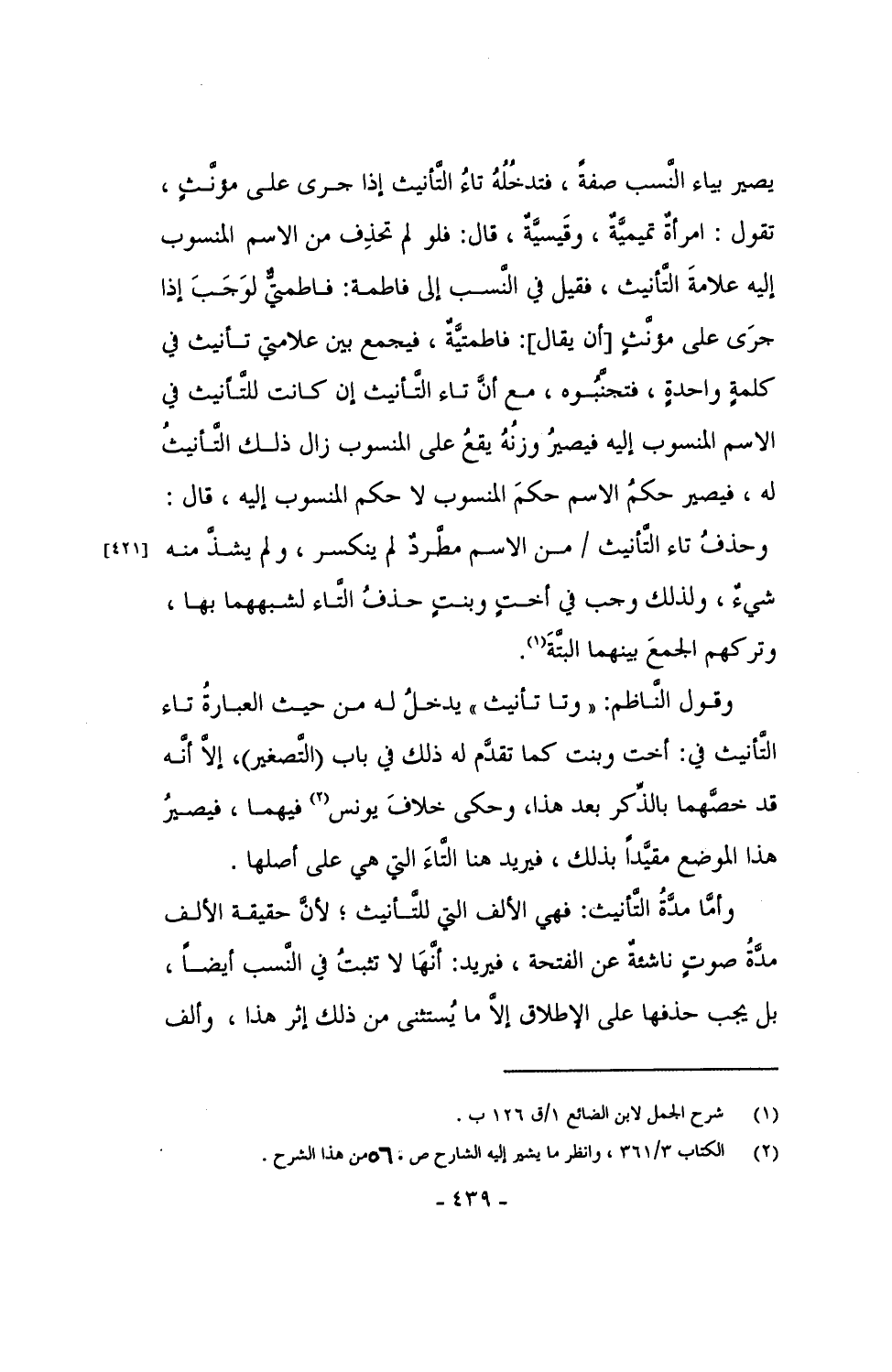 يصير بياء النسب صفة، فتدخله تاء التأنيث إذا جرى على مؤنثٍ، تقول: امرأة تميميَّةٌ، وقَيسيَّةٌ، قال: فلو لم تحذِف من الاسم المنسوب إليه علامة التأنيث، فقيل في النسب إلى فاطمة: فاطمتيٌّ لوجب إذا جرى على مؤنثٍ [أن يقال]: فاطتيَّةٌ، فيجمع بين علامتي تأنيث في كلمةٍ واحدةٍ، فتجنَّبوه، مع أن تاء التأنيث إن كانت للتأنيث في الاسم المنسوب إليه فيصير وزنُهُ يقعُ على المنسوب زال ذلك التأينث له، فيصير حكم الاسم حكم المنسوب لا حكم المنسوب إليه، قال: وحذف تاء التأنيث / من الاسم مطرد لم ينكسر، ولم يشذَّ منه شيء، ولذلك وجب في أختٍ وبنتٍ حذف التاء لشبههما بها، وتركهم الجمع بينهما البتَّة.