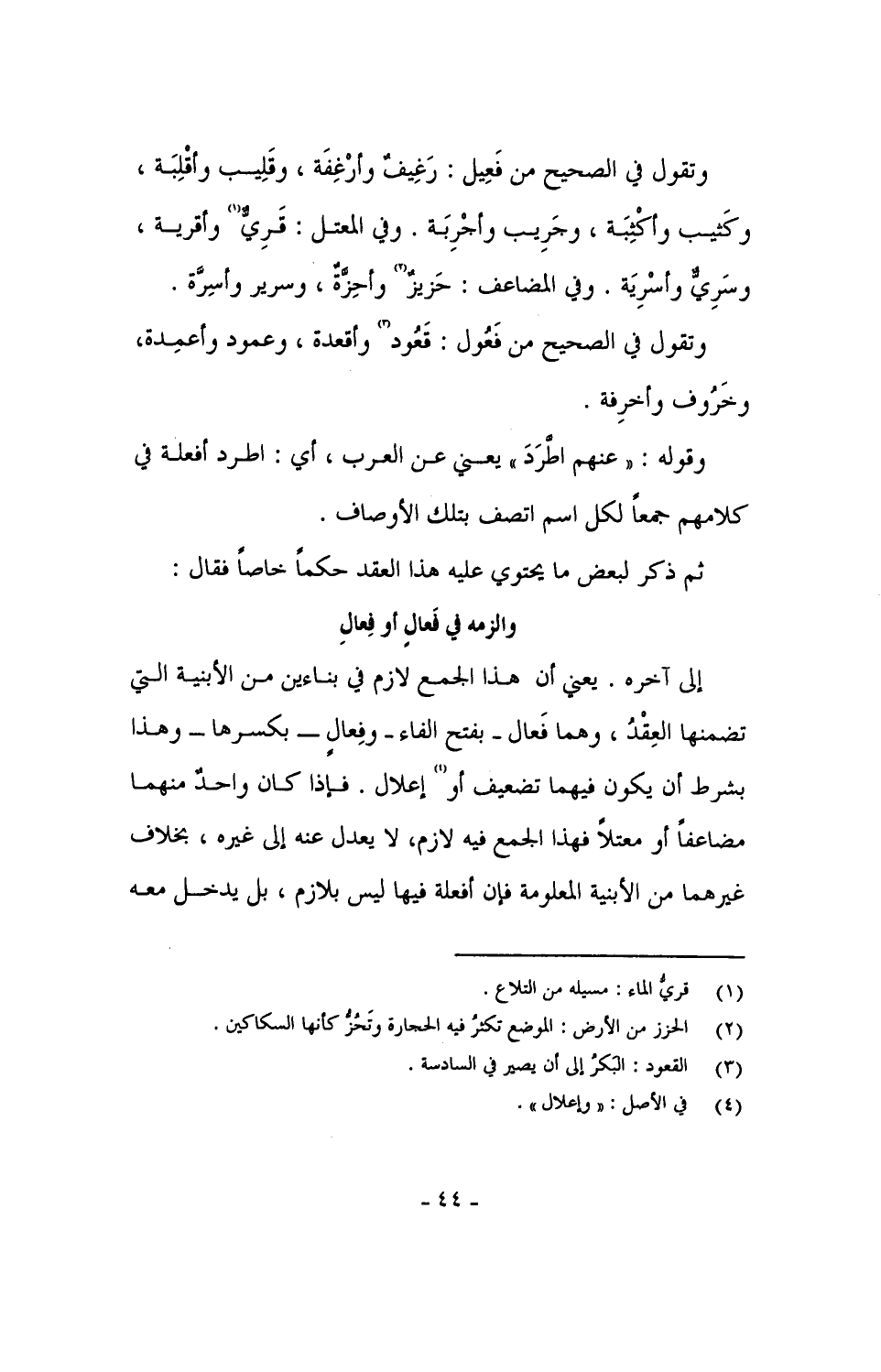 وتقول في الصحيح من فَعُول: قَعُود وأقعدة، وعمود وأعمدة، وخروف وأخرِفة.