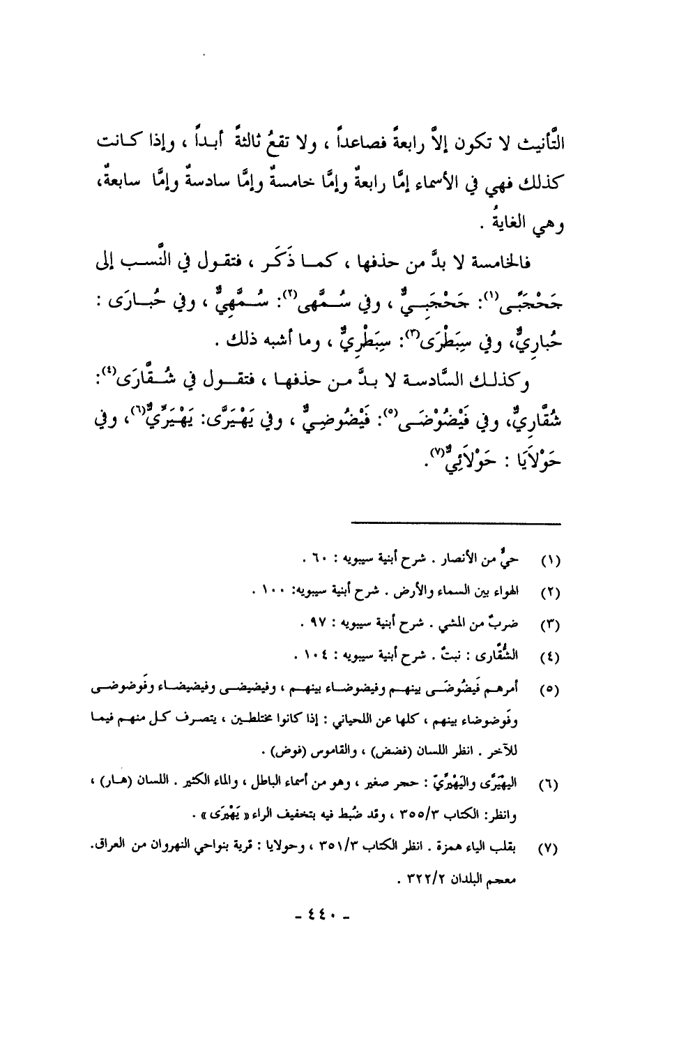 وكذلك السادسة لا بد من حذفها، فتقول في شُقَّارَى: شُقَّاريٌّ، وفي فَيْضُوْضَى: فَيْضُوضِيٌّ، وفي يَهْيَرَّى: يَهْيَرِّيٌّ، وفي حَوْلايا: حَوْلائِيٌّ.