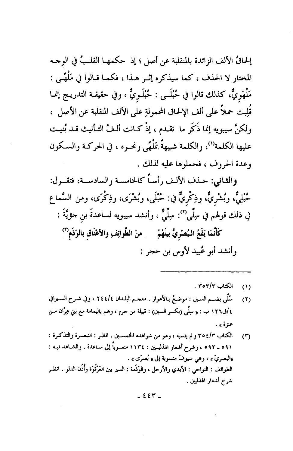 والثاني: حذف الألف رأساً كالخامسة والسادسة، فتقول: حُبْلِيٌّ، وبُشْرِيٌّ، وذِكْرِيٌّ في: حُبلى، وبُشرى، وذِكرى، ومن السماع في ذلك قولهم في سِلَّى: سِلِّيٌّ، وأنشد سيبويه لساعدةَ بن جؤيَّةَ: