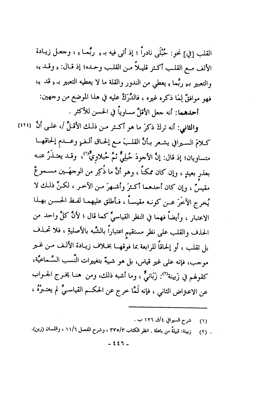 والثاني: أنه ترك ذكر ما هو أكثر من ذلك الأقلِّ /، على أن كلام السيرافي يشعر بأن القلبَ مع إلحاق ألفٍ وعدمِ إلحاقها متساويان؛ إذ قال: إنَّ الأجودَ حُبلِيٌّ ثم حُبلاويٌّ، وقد يعتذرُ عنه بعذرٍ بعيدٍ، وإن كان ممكناً، وهو أن ما ذكر من الوجهين مسموهٌ مقيسٌ، وإن كان أحدهما أكثرَ وأشهرَ من الآخر، لكن ذلك لا يُخرج الآخرَ عن كونه مقيساً، فأطلق عليهما لفظ الحسن بهذا الاعتبار، وأيضاً فهما في النظر القياسي كما قال؛ لأن كل واحد من الحذف والقلب على نظر مستقيمٍ اعتباراً بالشبه بالأصلية، فلا تحذف بل تقلب، أو إلحاقاً للرابعة بما فوقها بخلاف زيادة الالف من غير موجب، فإنه على غير قياس، بل هو شبيه بتغييرات النسب السَّماعية، كقولهم في زبينة: زَبَانيٌّ، وما أشبه ذلك، ومن هنا يخرج الجواب عن الاعتراض الثاني، فإنه لما خرج عن الحكم القياسي لم يعتبره،