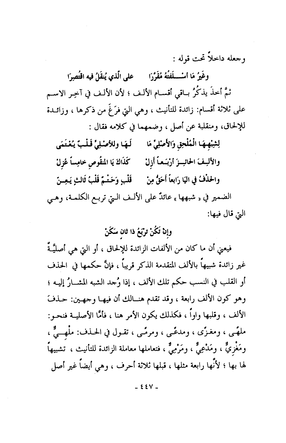 فيعني أن ما كان من الألفات الزائدة للإلحاق، أو التي هي أصلية غير زائدة شبيهاً بالالف المتقدمة الذكر قريباً، فإن حكمها في الحذف أو القلب في النسب حكم تلك الألف، إذا وُجد الشبه المشارُ إليه؛ وهو كون الألف رابعة، وقد تقدم هنالك أن فيها وجهين: حذفَ الألف، وقلبها واواً، فكذلك يكون الأمر هنا، فأما الأصلية فنحو: ملهًى، ومغزًى، ومدعًى، ومرمًى، فتعاملها معاملة الزائدة للتأنيث، تشبيها لها بها؛ لأنها رابعة مثلها، قبلها ثلاثة أحرف، وهي أيضاً غير أصل