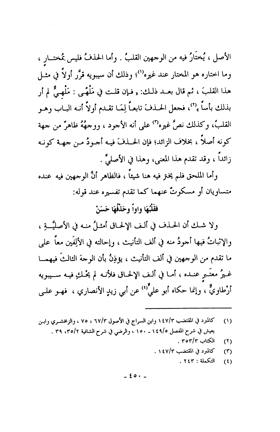 ولا شك أن الحذف في ألف الإلحاق أمثلُ منه في الأصلية، والإثباتُ فيها أجودُ منه في ألف التأنيث، وإحالته في الألفين معاً على ما تقدم من الوجهيم في ألف التأنيث، يؤذِنُ بأن الوجه الثالث فيهما غير معتبرٍ عنده، أما في ألف الإلحاق فلأنه لم يحكِ فيه سيبويه أرْطاويٌّ، وإنما حكاه أبو علي عن أبي زيد الأنصاري، فهو على