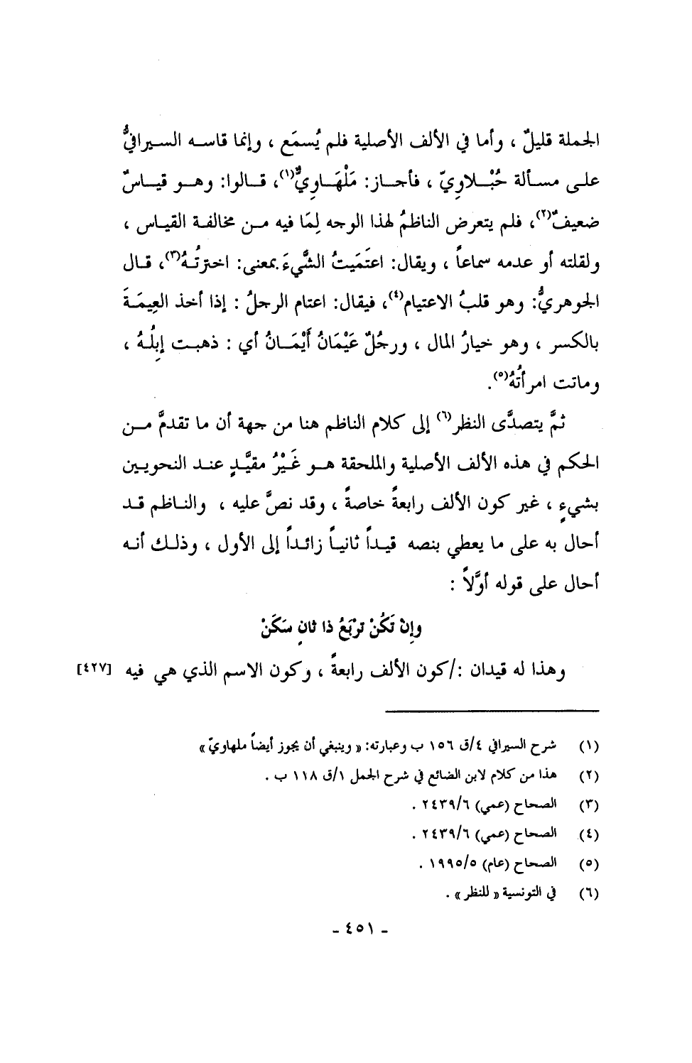 ثم يتصدى النظر إلى كلام الناظم هنا من جهة أن ما تقدم من الحكم في هذه الألف الأصلية والملحقة هو غيرُ مقيَّدٍ عند النحويين بشيء، غير بكون الألف رابعةً خاصةً، وقد نص عليه، والناظم قد أحال به على ما يعطي بنصه قيداً ثانياً زائداً إلى الأول، وذلك أنه أحال على قوله أولاً: