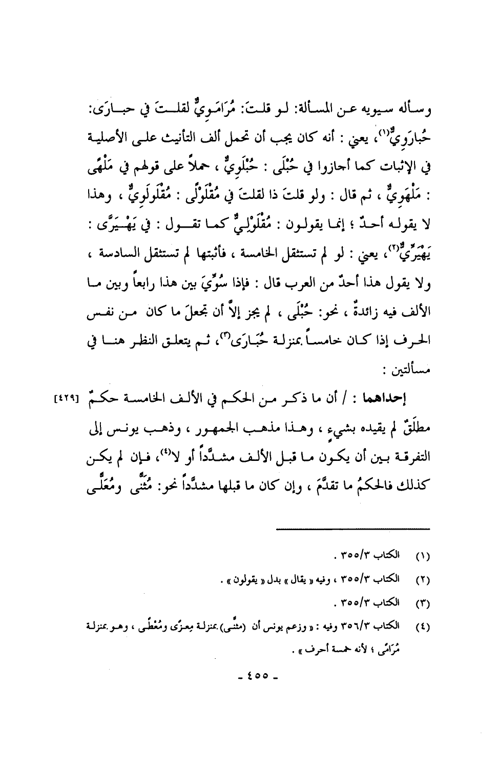 وسأله سيبويه عن المسألة: لو قلتَ: مُرَامَوِيٌّ لقلتَ في حبارى: حُبارَوِيٌّ، يعني: أنه كان يجب أن تحمل ألف التأنيث على الأصلية في الإثبات كما أجازوا في حُبْلَى: حُبْلَوِيٌّ، حملاً على قولهم في مَلْهًى: مَلْهَوِيٌّ، ثم قال: ولو قلتَ ذا لقلتَ في مُقْلَوْلًى: مُقْلَولَوِيٌّ، وهذا لا يقوله أحدٌ؛ إنما يقولون: مُقْلَوْلِيٌّ كما تقول: في يَهْيَرَّى: يَهْيَرِّيٌّ، يعني: لو لم تستثقل الخامسة، فأثبتها لم تستثقل السادسة، ولا يقول هذا أحدٌ من العرب قال: فإذا سُوِّيَ بين هذا رابعاً وبين ما الألف فيه زائدةٌ، نحو: حُبْلَى، لم يجز إلا أن تجعلَ ما كان من نفس الحرف إذا كان خامساً بمنزلة حُبَارَى، ثم يتعلق النظر هنا في مسألتين: