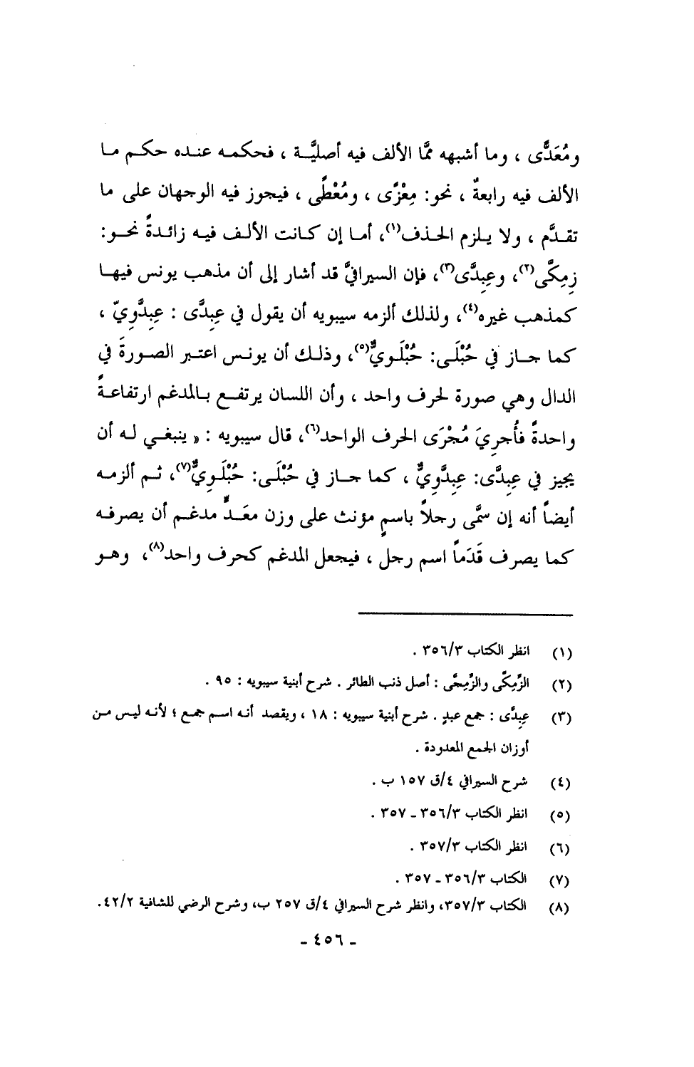 ومُعَدًّى، وما أشبهه مما الألف فيه أصلية، فحكمه عنده حكم ما الألف فيه رابعة، نحو: مِعْزًى، ومُعْطًى، فيجوز فيه الوجهان على ما تقدَّم، ولا يلزم الحذف، أما إن كانت الألف فيه زائدةً نحو: زِمِكَّى، وعِبِدَّى، فإن السيرافي قد أشار إلى أن مذهب يونس فيها كمذهب غيره، ولذلك ألزمه سيبويه أن يقول في عِبِدَّى: عِبِدَّوِي، كما جاز في حُبْلَى: حُبْلَويٌّ، وذلك أن يونس اعتبر الصورة في الدال وهي صورة لحرف واحد، وأن اللسان يرتفع بالمدغم ارتفاعةً واحدةً فأُجريَ مُجْرَى الحرف الواحد، قال سيبويه: "ينبغي له أن يجيز في عِبِدَّى: عِبِدَّوِيٌّ، كما جاز في حُبْلَى: حُبْلَوِيٌّ، ثم ألزمه أيضاً أنه إن سمَّى رجلاً باسمٍ مؤنث على وزن معَدٍّ مدغم أن يصرفه كما يصرف قَدَماً اسم رجل، فيجعل المدغم كحرف واحد، وهو